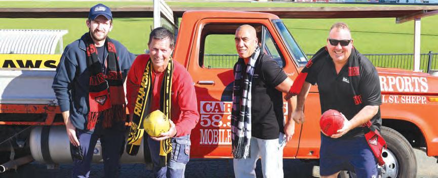 FOOTY TIPPING... Adviser’s Footy Tipping Competition has wrapped up for the 2025 season, with Darryl Emmett winning a Grand Final Party Pack Valued at $1,500. From left, Danile Strudwick of Total Tools, Darryl Emmett of GV Carports and David Mohi of Shepparton of Carpet Call and Jarrod Harry of Linemasta. Photo: Emma Harrop