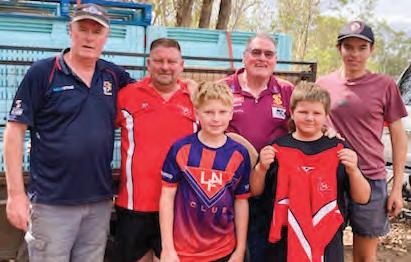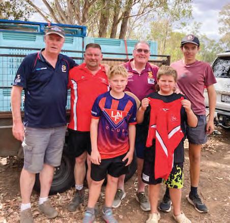 WORKING TOGETHER... The four fruit bins were transported by trailer to affected areas. Pictured from back left: Paul Phillips from Shepparton United Football Club, Anthony Allison from Longwood Football Club, Phil Stevenson from Shepparton Football Club, Cooper Goodall Longwood Football Club. Pictured front from left: Coen Allison and Kaiden Carson from Longwood Football Club. Photo: Supplied.