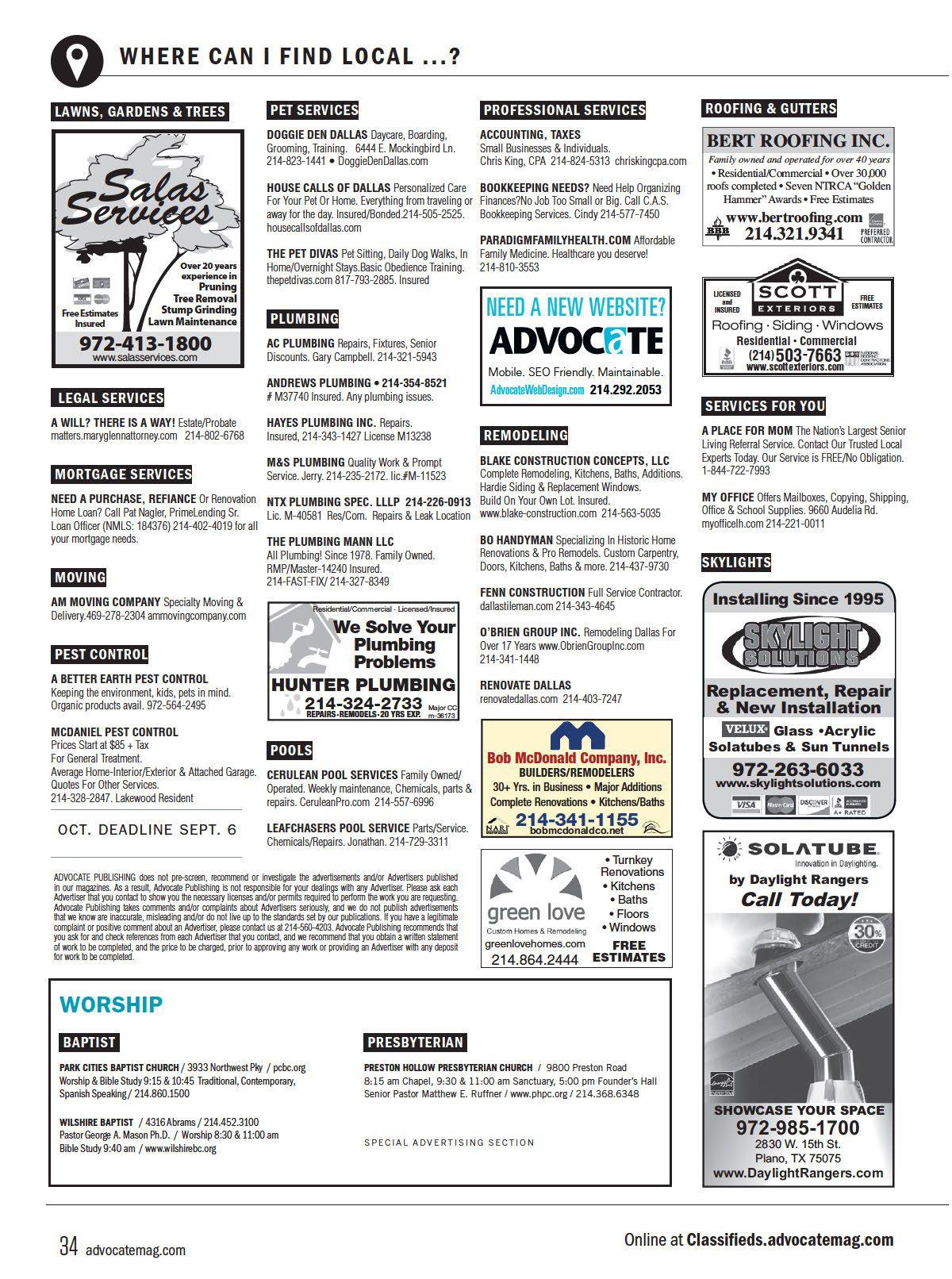 3 - Certified Applicators 214-327-9311 FULLY INSURED Commercial/Residential www.holcombtreeservice.com IRISH RAIN SPRINKLER SYSTEMS REPAIR SPECIALISTS SYSTEM REDESIGN DRAIN HELP 28+ Yrs. Exp. Licensed by State of Texas #2738 214-827-7446 p Discover HEADS UP! Inspection Special -10% Off MENTION OUR AD IN ADVOCATE OCTOBER DEADLINE SEPTEMBER 6 214.560.4203 TO ADVERTISE