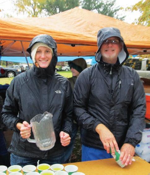 Jerry and Julie Reddy fill cups with water and Gatorade at the White Rock Marathon Dec. 3. They were among volunteers who braved the cold and rainy weather. Photo by Pete Puckett.