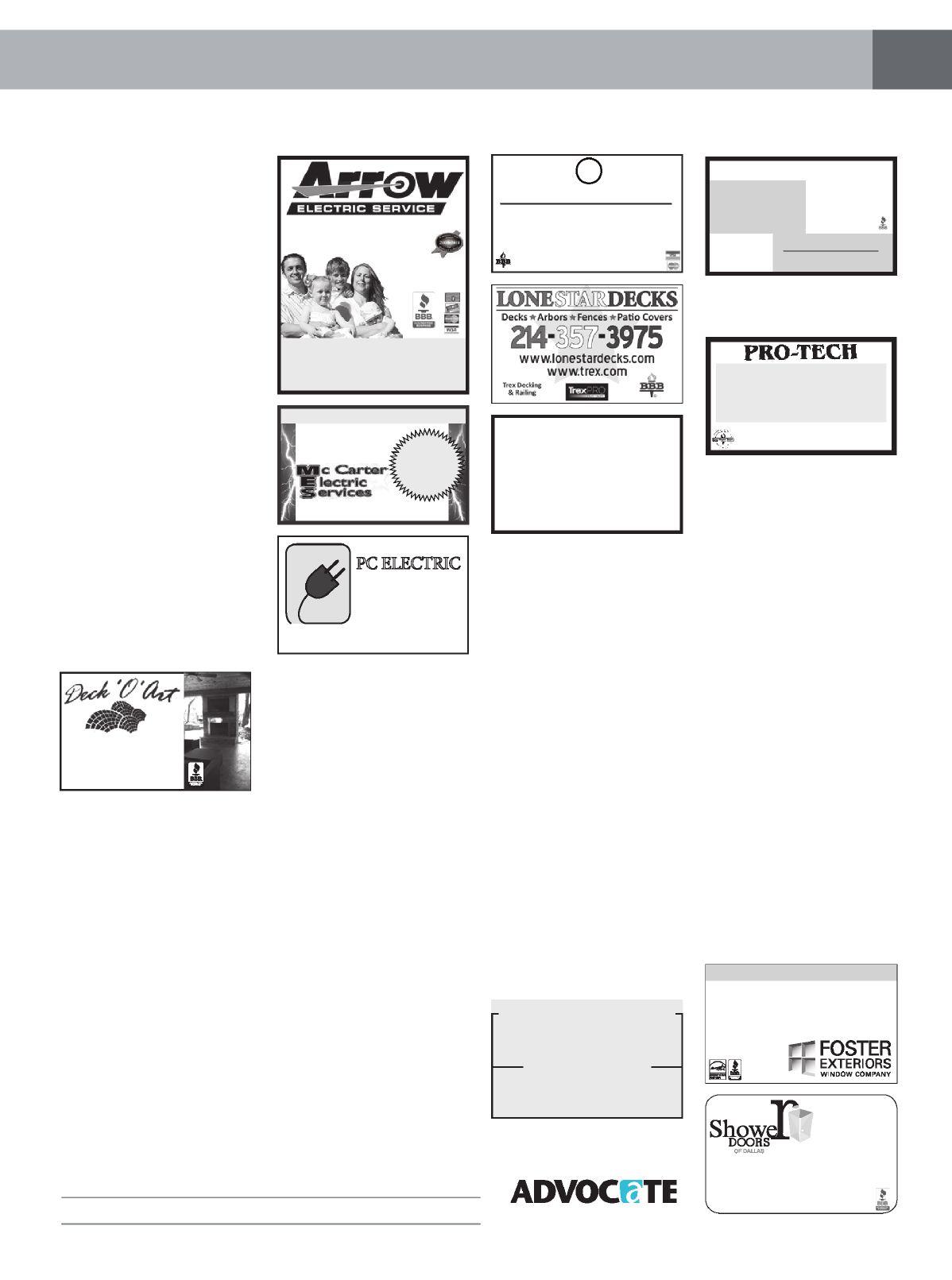 ADVOCATE PUBLISHING does not pre-screen, recommend or investigate the advertisements and/or Advertisers published in our magazines. As a result, Advocate Publishing is not responsible for your dealings with any Advertiser. Please ask each Advertiser that you contact to show you the necessary licenses and/or permits required to perform the work you are requesting. Advocate Publishing takes comments and/ or complaints about Advertisers seriously, and we do not publish advertisements that we know are inaccurate, misleading and/or do not live up to the standards set by our publications. If you have a legitimate complaint or positive comment about an Advertiser, please contact us at 214-560-4203. Advocate Publishing recommends that you ask for and check references from each Advertiser that you contact, and we recommend that you obtain a written statement of work to be completed, and the price to be charged, prior to approving any work or providing an Advertiser with any deposit for work to be completed.