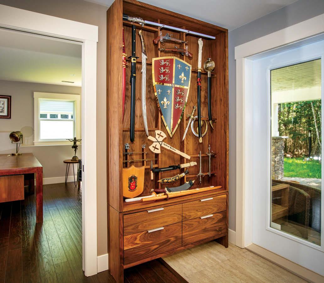 Burnett built the curio cabinet of walnut to house the client’s replica weapon and memorabilia collection. It has a grid structure to mount the swords on lucite dowels and magnets giving the appearance they’re floating in the cabinet.