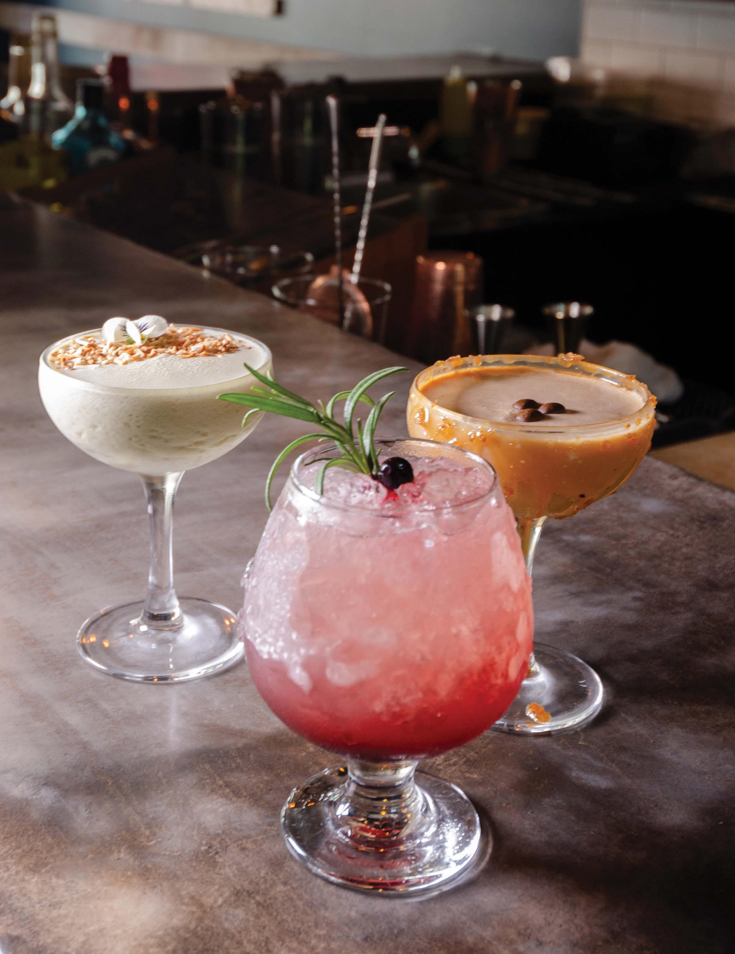 Homemade mulled spice syrup and a black currant liqueur put a twist on the Bramble, while matcha spruces up a coconut daquiri. The sweet, rich fl avour of Vietnamese coffee inspires the third cocktail.