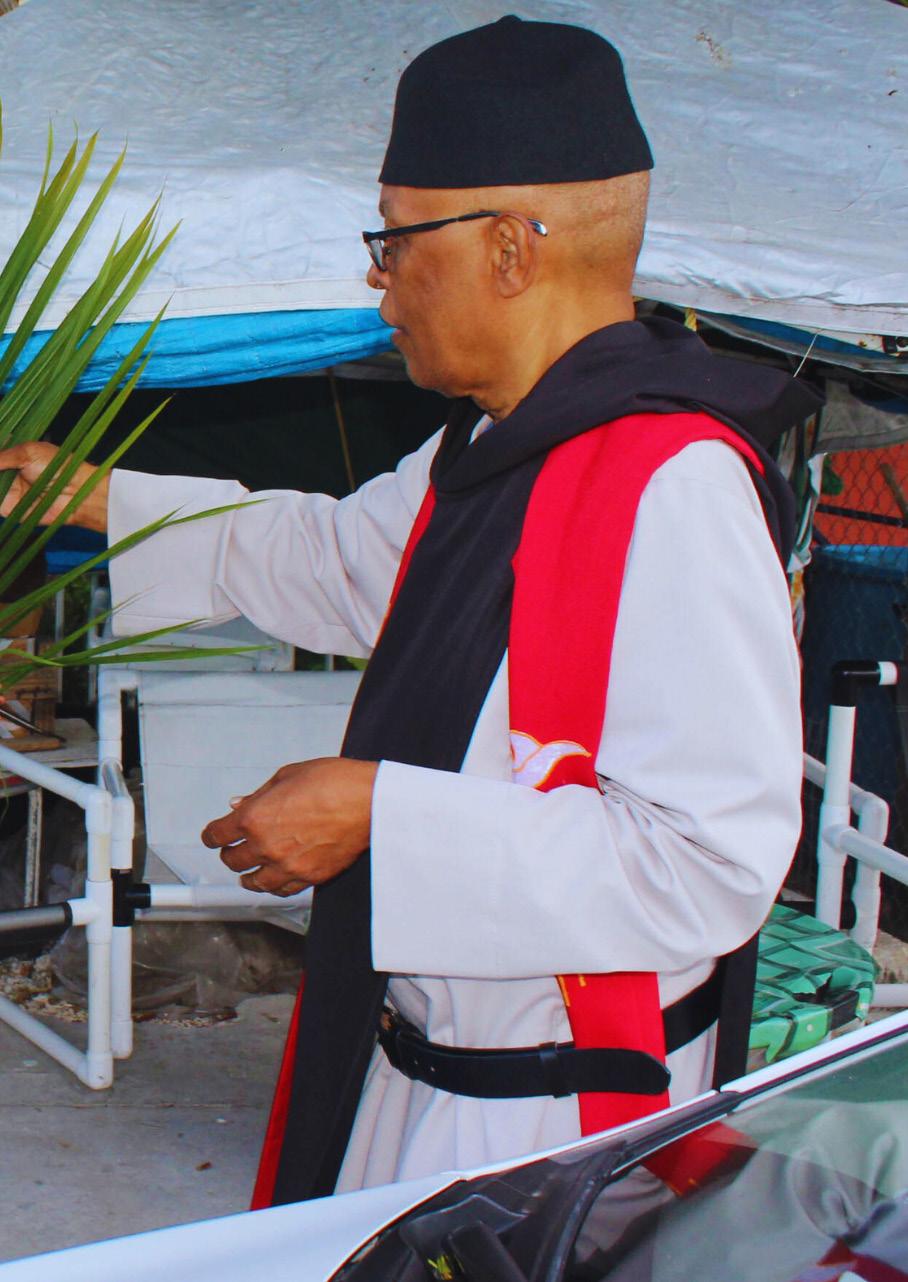 Monsignor Vincent Blackett during a Palm Sunday procession through the community of Deacons Road gives a palm to the lady.