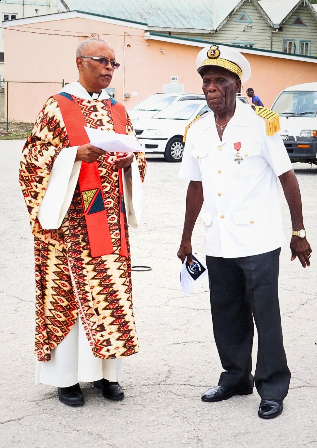 Monsignor Vincent and the late Lord High Admiral Vernon Watson in conversation at the start of the parade to the St.Patrick Roman Catholic Cathedral for a Thanksgiving Mass to celebrate the Barbados Landship.