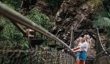 This one is just 40 metres return! Simply open the doors and get out of your car for awe-inspiring views over the sheer walls of the plateau you’re driving along down over Twin and Rainbow Falls all the way to the Pacific Ocean beyond. You can wear thongs on this hike!
