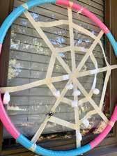 Create a spider web by placing masking tape across a hula hoop (or door frame, open cardboard box, or any other space that works). Start with long strips of tape to create the base of the web, then tear off shorter pieces to create the middle portions in between the longer strips. Make sure to keep the sticky side of the tape all on one side, and that it will be sticky enough to catch a cotton ball.