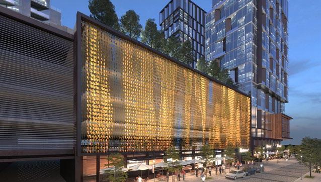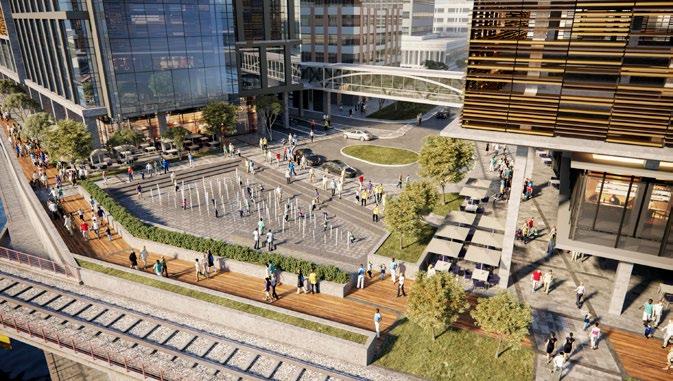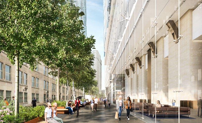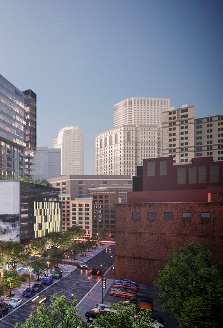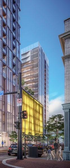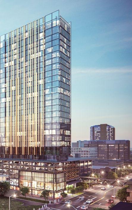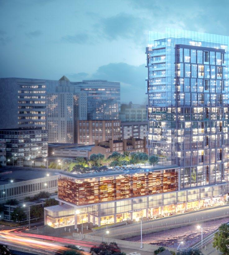 The program consists of 275,000 SF of commercial office space, 5,000 SF of street level retail, and 20,000 SF research and development space. The building amenities include a 5,000 SF reception space with co-working area, recreation, cafe, security, fitness center, and a lounge. The outdoor amenities include a number of occupiable terraces for office tenants and activated parklet with public art installation. Set to occupy an existing surface parking lot, the development will also include multi-modal transportation accommodations consisting of 384 parking spaces, bike storage spaces, as well as a bike and electric scooter sharing program for both project tenants and the general public.