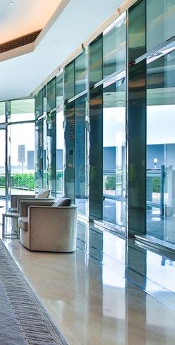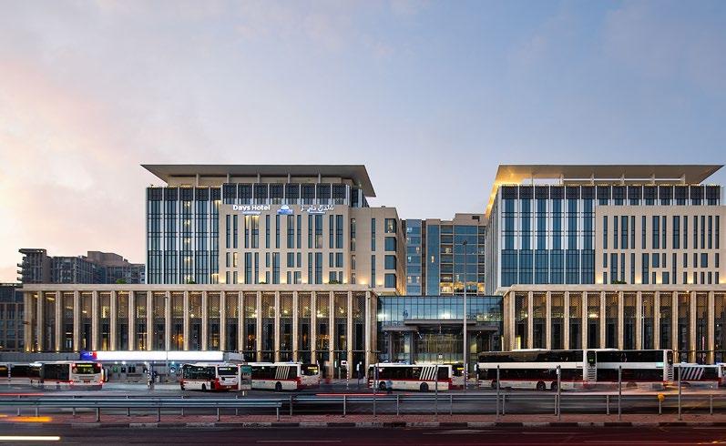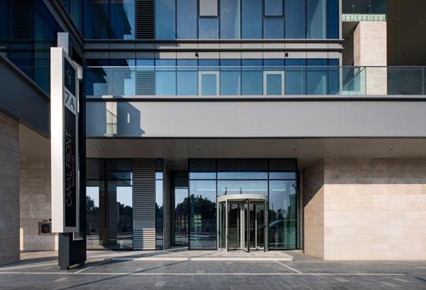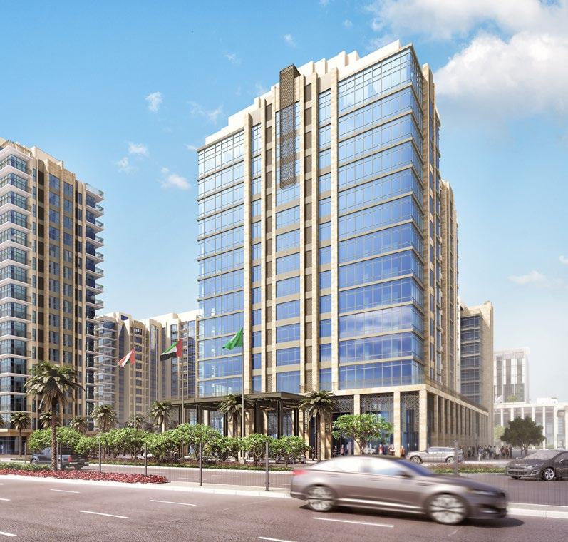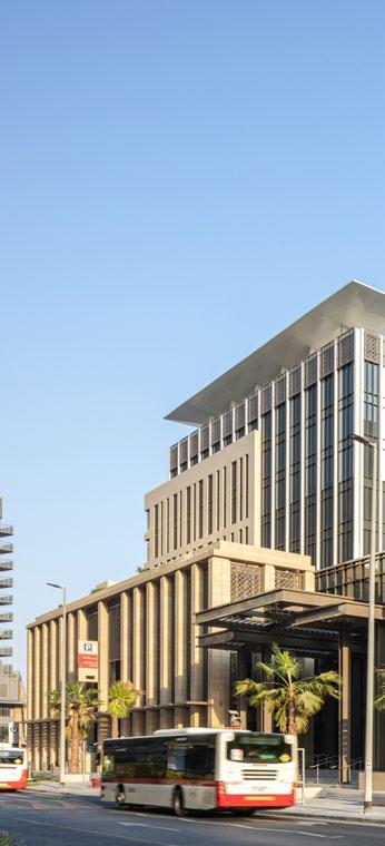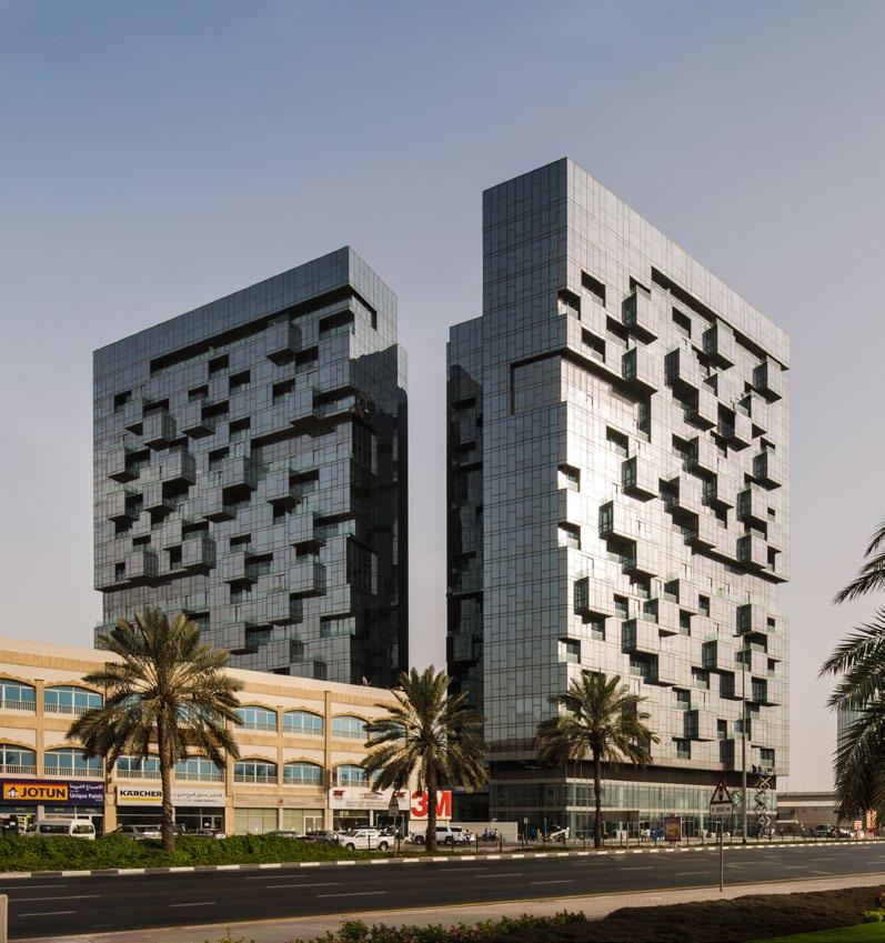 The Office Tower is part of the Deira renaissance and is the first phase of the construction in the Deira Waterfront Development. The tower is part of the first transit-oriented development in Dubai, with a unique combination of office, retail, hospitality and public transportation under one complex. This development is a main hub for Dubai’s bus system and also a primary interchange hub for the metro system. Even though the development is a major transit hub, it is also uniquely pedestrian-oriented, with convenient walking access through breezeways and tree-lined sidewalks. The tower’s lobby is integrated to allow for quick access to many shops and eateries, as well as to the hotel and transit network. This is the first structure in Dubai to be built on top of the existing foundations of the underground metro station.