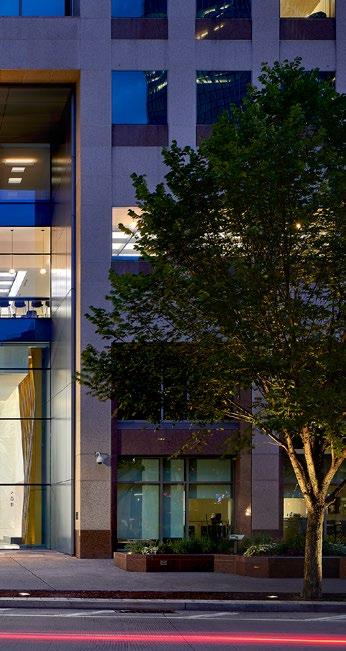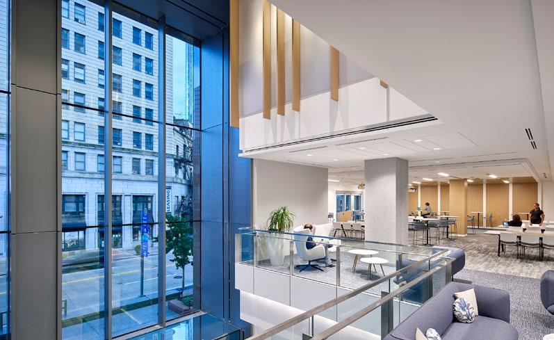 Built in the 1980’s, the facade of Fifth Avenue Place did not convey the brand and forward thinking that Highmark Health envisioned for their corporate entrance. AE7 created a dramatic transformation, eliminating the dated obstructive architectural elements, and created a visually open glass entrance. The curtain wall system spans four stories, capturing the full portal of the building entrance. To distinguish the public lobby space from the upper corporate amenity and office floors, a horizontal louver system divides the facade, which serves as screening for privacy, as well as the west facing sun. A new metal clad portal frames the facade and bridges the exterior to interior transition, welcoming pedestrians into the revitalized ground floors of Fifth Avenue Place.