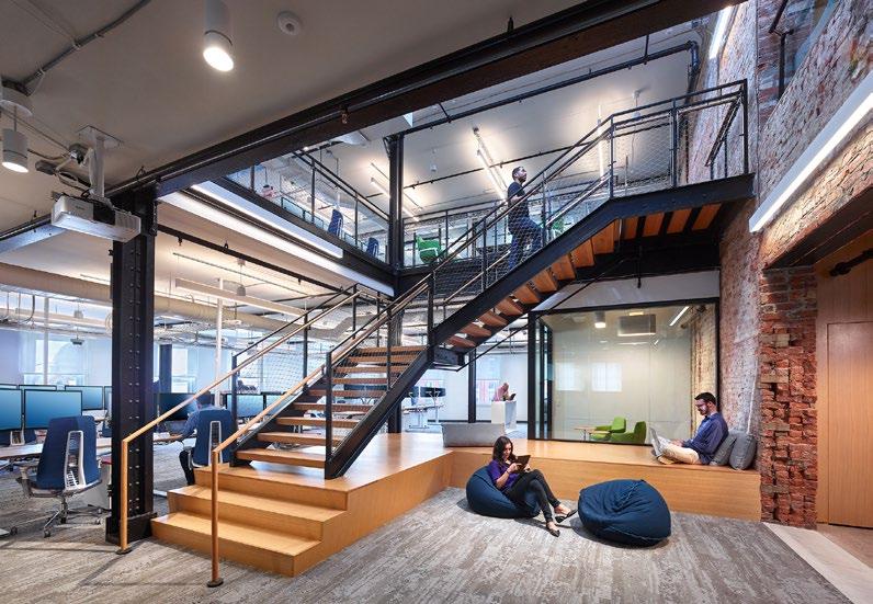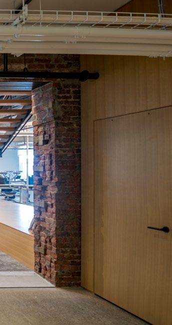 Less than two years after AE7’s successful completion of a 3,300 SF office for NUMO, a fintech incubator, the company has undergone rapid growth and engaged AE7 to design their new expanded office space. NUMO 2.0 totals 12,000 SF and occupies the second and third floors of the historical Stevenson Building, a 130-year-old masonry building with an exposed steel structure. The client fell in love with the character of the building and welcomed the opportunity AE7 presented to integrate a clean tech space with the character of the original building elements. The exposed steel became a feature of the office and the original brick walls were left unaltered throughout. The design enhanced the visual connections between spaces and the outdoors by orienting program and circulation on axis with windows, brick portals, and glass wall systems.
