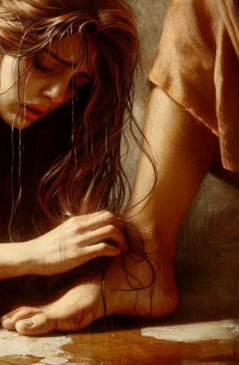 Con sus largos cabellos que semejaban las copas frondosas de las palmeras de Jericó, iba limpiando con ternura infinita esos pies, mientras lloraba y ungía, mientras ungía y lloraba. Al mismo tiempo esos labios que hasta entonces solo conocieron de los besos de la lascivia, de la pasión, de la hipocresía, de la traición, del engaño, de la impureza, esos labios sintieron a los pies del MAESTRO la necesidad intensa de purificación… y comenzaron a besar, a besar mucho, pero no con los besos de los labios
