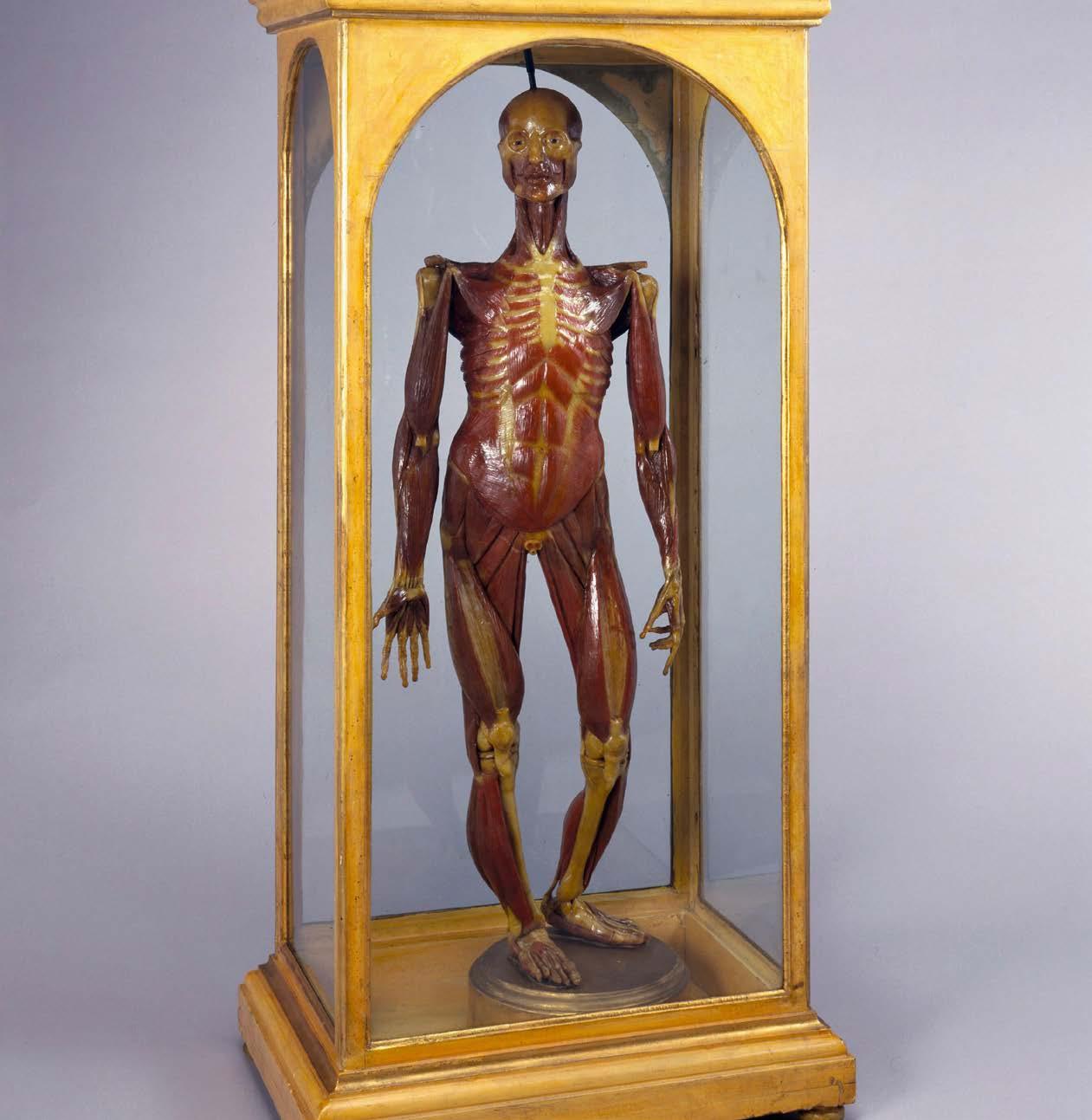 Dieses Modell zeigt in halber Lebensgröße die Muskeln und Knochen des Körpers in oberflächlicher Dissektion. Einige Muskeln von Brustkorb und Extremitäten wurden nicht dargestellt, sodass die darunter liegenden Strukturen sichtbar sind. In weiteren Modellen der achtteiligen Serie wurden tiefere Schichten entfernt, um die unterschiedlichen Regionen des Körpers darzustellen. Die Modelle dienten im zoologischen Museum der Universität Florenz dem anatomischen Unterricht. Hergestellt wurden sie vermutlich in den Werkstätten von Clemente Susini (1754 – 1814), einem der besten Wachsmodellierer seiner Zeit. Seine Arbeiten waren berühmt für das anatomische Detailreichtum sowohl hinsichtlich Struktur als auch Farbgebung.