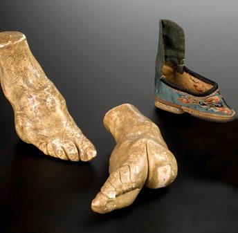 Das Füßebinden war ein bis ins 20. Jahrhundert in China verbreiteter Brauch der Körpermodifikation, bei dem die Füße von kleinen Mädchen durch Knochenbrechen und anschließendes extremes Abbinden irreparabel deformiert wurden. Hintergrund war ein vermutlich bereits seit dem 10. Jahrhundert existierendes Schönheitsideal für den Frauenfuß, das Lotosfuß oder Lilienfuß genannt wurde. Ziel waren kleine Füße von etwa 10 Zentimetern, die, in individuell gefertigte und geschmückte Seidenschuhe gebunden, für die Schönheit und Häuslichkeit der Frau stehen und gleichzeitig ihren Gang verändern sollten. – Das vorliegende Gipsmodell eines linken Fußes stammt aus Hongkong und zeigt die durch das Füßebinden hervorgerufenen Schädigungen. Daneben sind ein gesunder rechter Fuß und ein Paar gestickte Seidenschuhe zu sehen.
