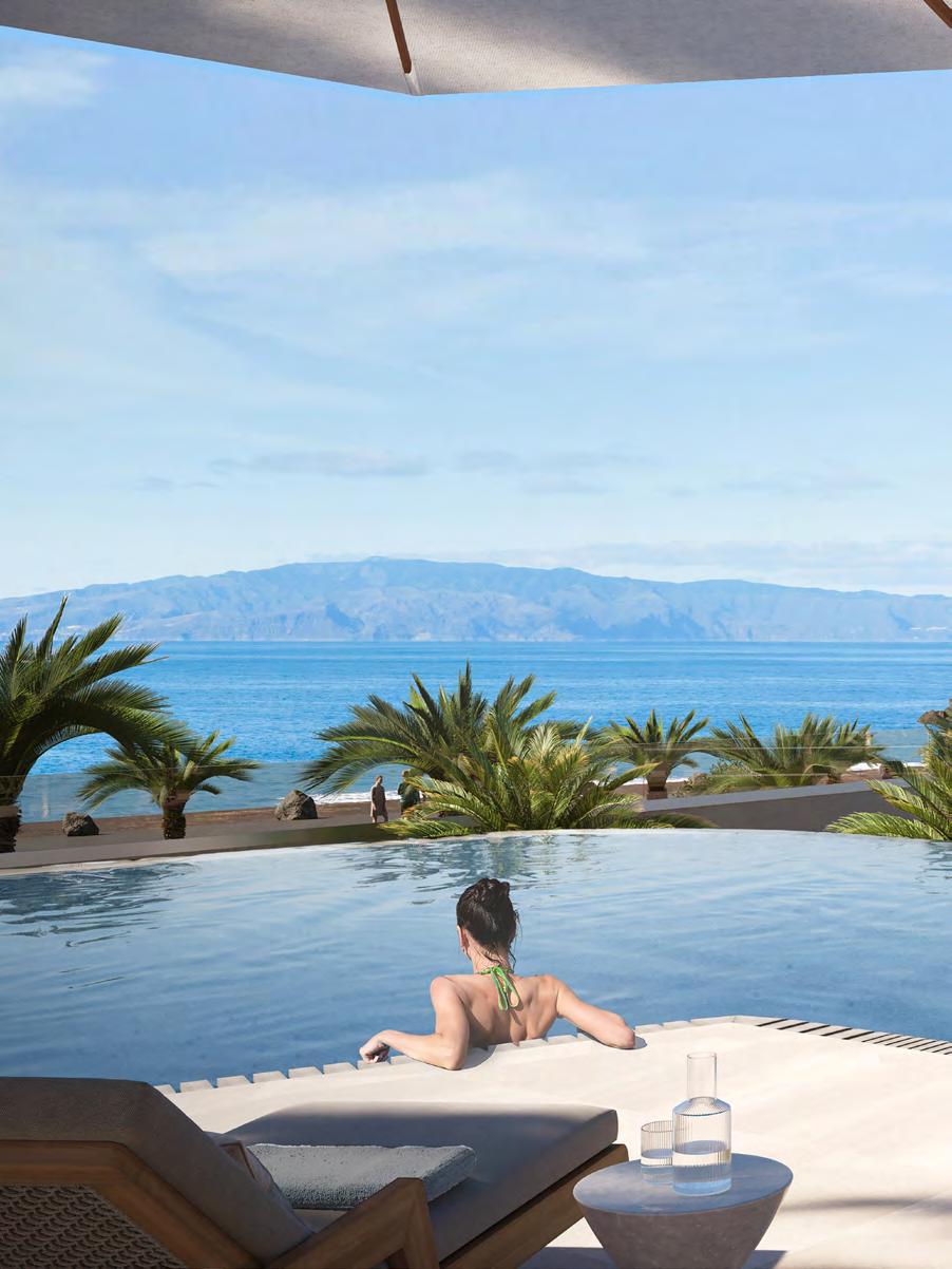 Swimming pool with a water surface of 1,440 m2 and a spacious sunbathing terrace. The pool will be an infinity type, facing the ocean and the island of La Gomera.
