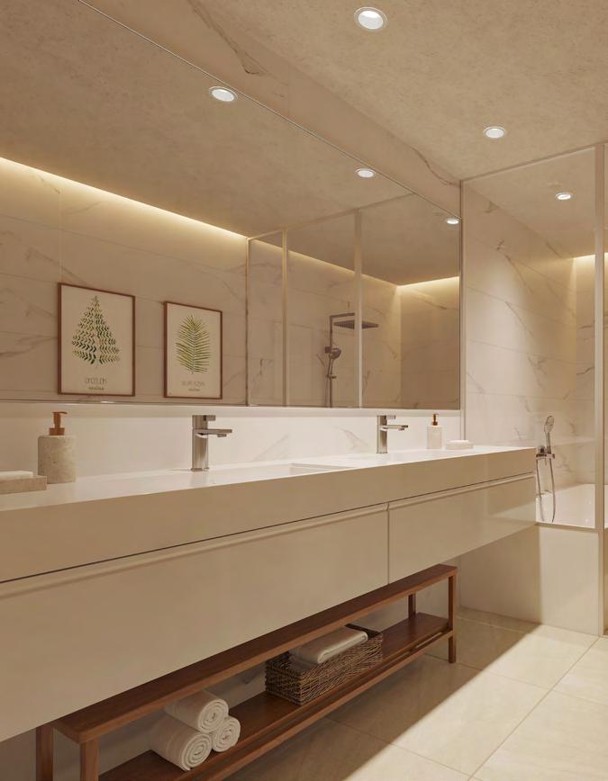 The master bathroom will have a double-breast ceramic washbasin with a monobloc mixer tap and a wall-hung vanity unit. The toilet will be a compact wall-mounted model with a concealed cistern system giving the overall design a chic, modern look.