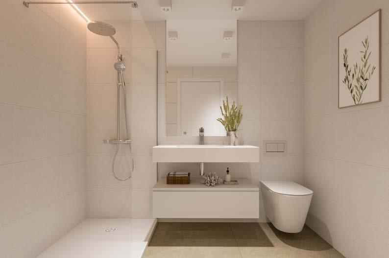 › Porcelain stoneware flooring as in the rest of the dwelling, finished with a lacquered skirting board, and damp-proof laminated plasterboard walls finished in plain emulsion paint.