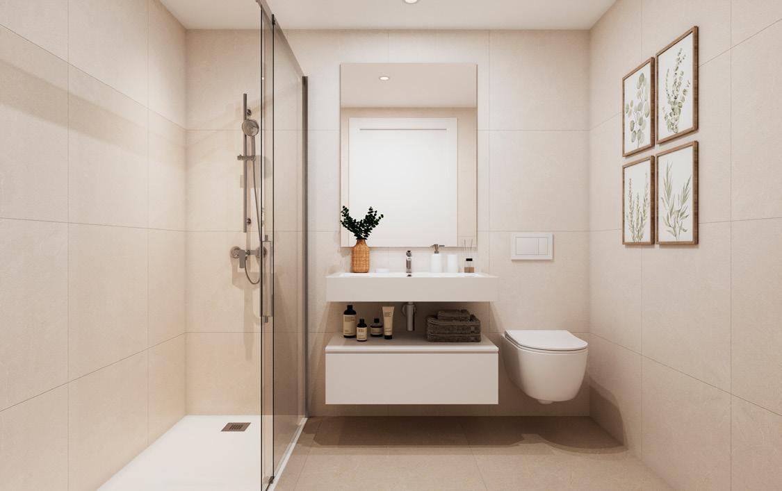 El baño principal contará con lavabo cerámico con grifería monomando y mueble suspendido. El inodoro será compacto y suspendido con sistema de cisterna oculta para aportar diseño al conjunto. La ducha contará con mampara corredera y con grifería termostática, que tendrá un pavimento cerámico.