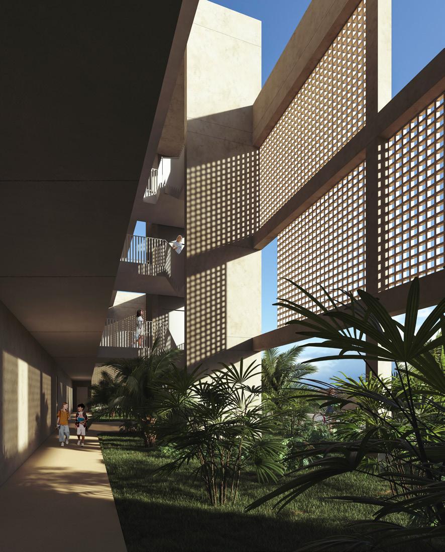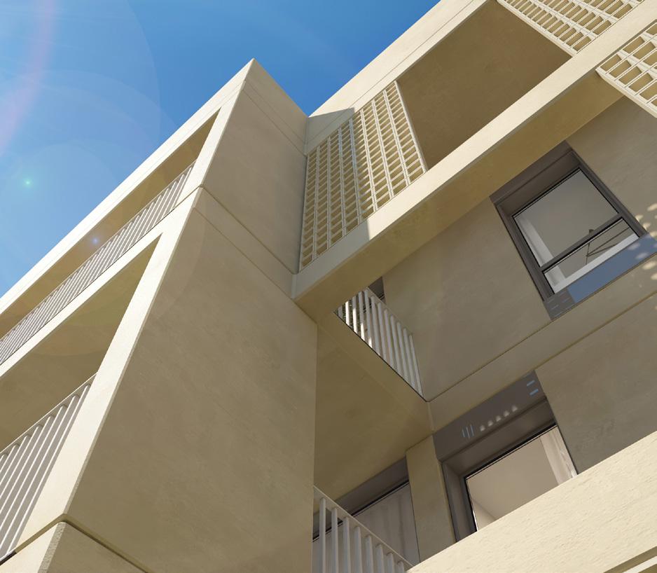 Para dotar de belleza y dinamismo al residencial, se ha proyectado para los bloques que lo componen una fachada de doble hoja, con hoja exterior de fábrica de ladrillo cerámico de ½ pie de espesor, acabada con un revoco de mortero monocapa combinado con celosías. Para garantizar las condiciones de confort en el interior de la vivienda, la hoja interior consta de un trasdosado de placa de yeso sobre perfilería metálica con montantes cada 40 cm con aislamiento térmico a base de paneles de lana mineral.