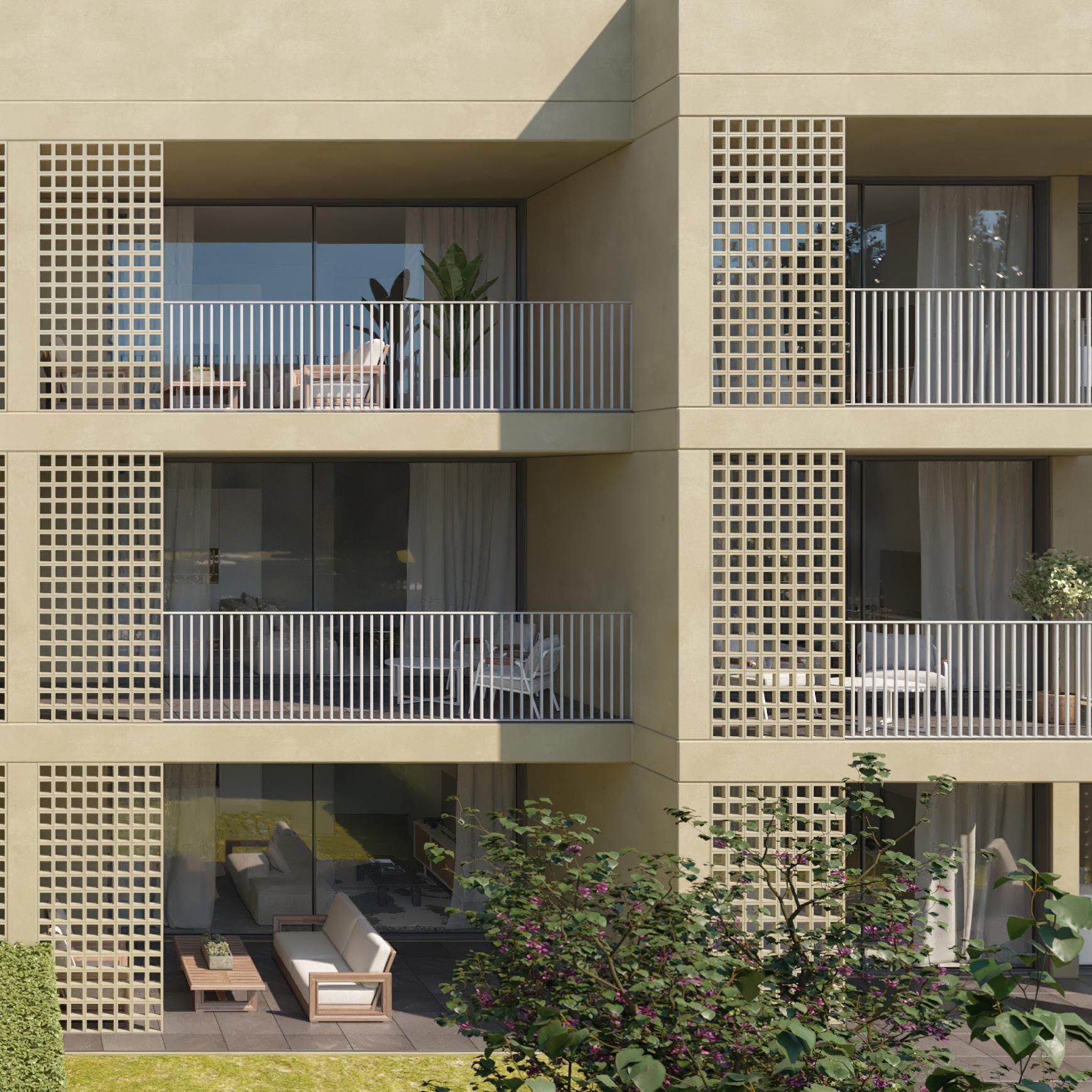 L’Alqueria es una promoción de 63 viviendas de 2 y 3 dormitorios distribuidas en tres bloques con un diseño mediterráneo contemporáneo de planta baja más dos alturas y ático. Además, cada vivienda tiene su propio trastero y plaza de aparcamiento.