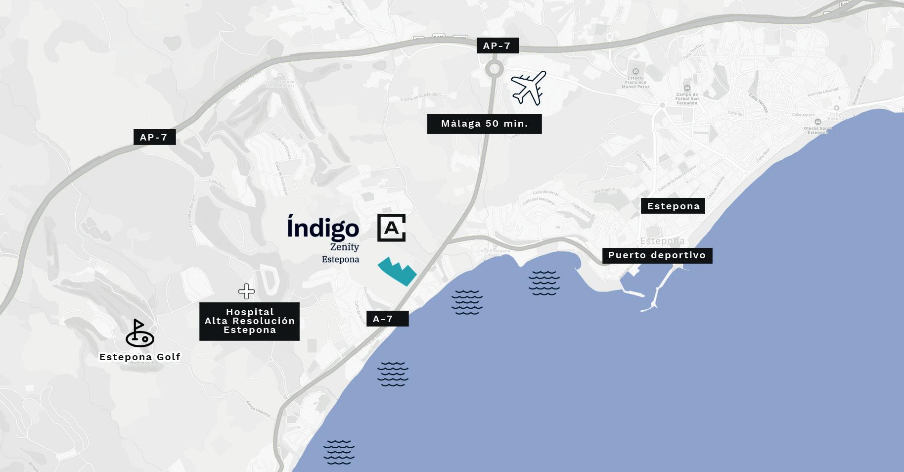 La ubicación de Índigo supone la combinación perfecta entre vivir en un entorno natural y la comodidad de estar a un paso del centro urbano de Estepona. Además de contar con un litoral que se extiende a lo largo de 20 kilómetros, la ciudad dispone de equipamientos educativos, comerciales y de ocio para todo tipo de público.