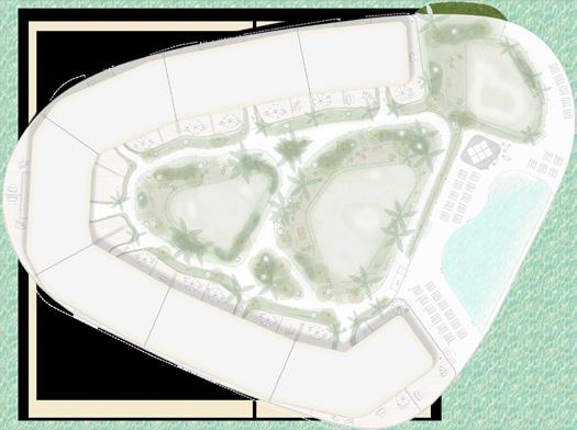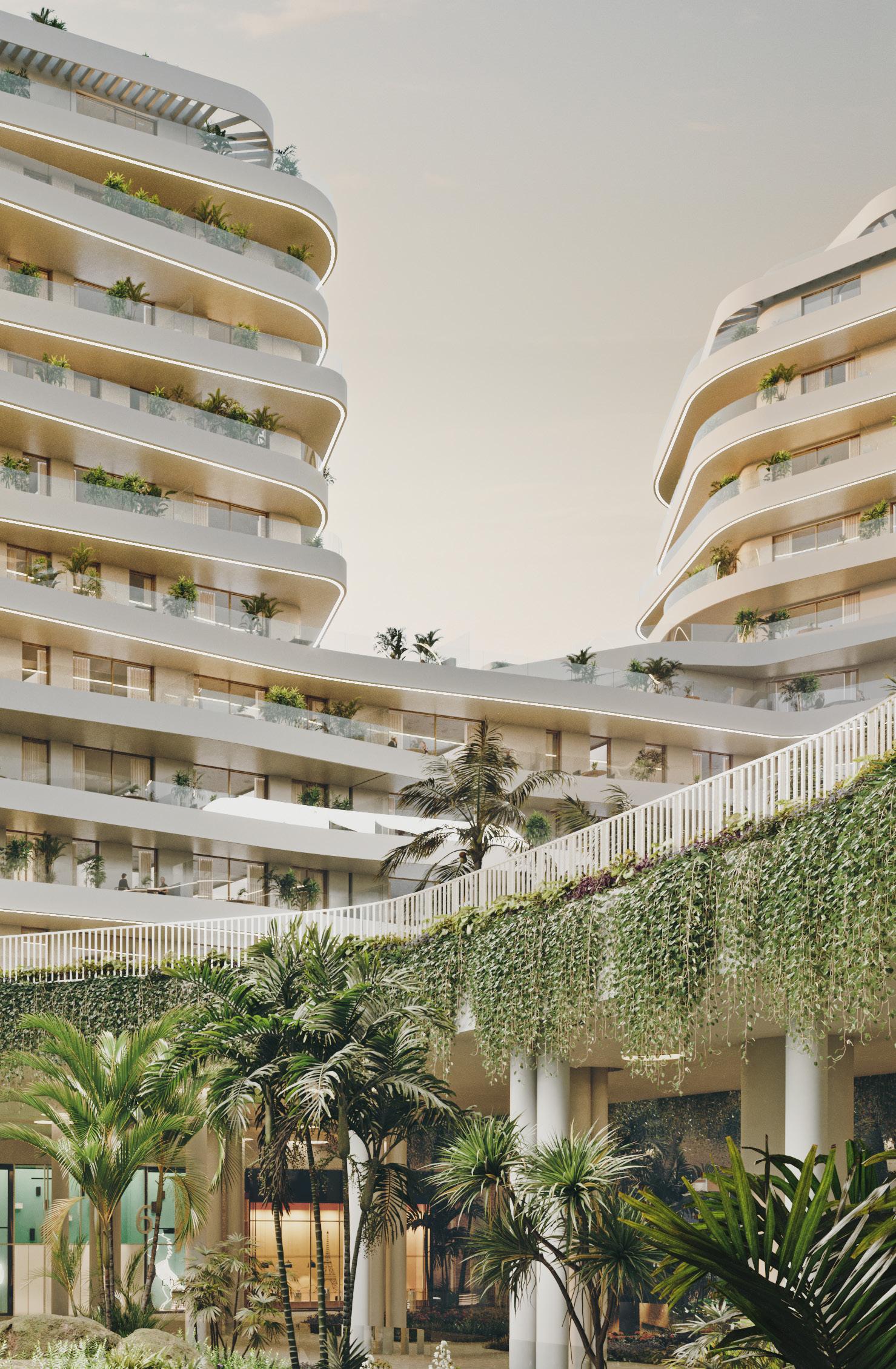 Con una estética muy atractiva inspirada en las formas redondeadas de la naturaleza, su fachada se caracteriza por sus líneas ondulantes que tanto recuerdan al oleaje del mar. Para que el edificio se integre perfectamente con el entorno, a través de la distribución de las fachadas y el uso del color blanco se aprovecha el poder termorregulador del mar en la climatización de los diferentes edificios, reduciendo así también su consumo energético y limitando significativamente las emisiones de CO₂. En su interior, se ha planteado una distribución de las parcelas en islas que permiten aprovechar al máximo el espacio y proporcionar mejores vistas al mar, un concepto atractivo y novedoso que permite proporcionar lo mejor del lugar.