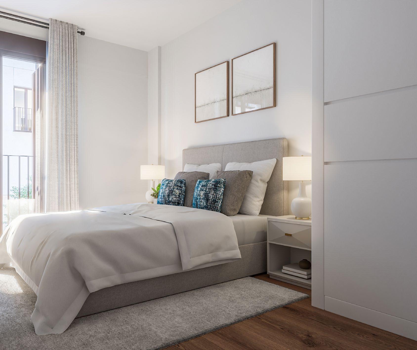 › Doors inside the dwelling will be finished in white lacquer with recessed spacers and steelcoloured handles, giving your home a smart, contemporary appearance. In general, they will be swing opening, except in those cases where sliding doors are more advisable to improve the usability of the room being accessed. Door leaves will be 2.10m high, thus giving you a greater sense of space inside your home.