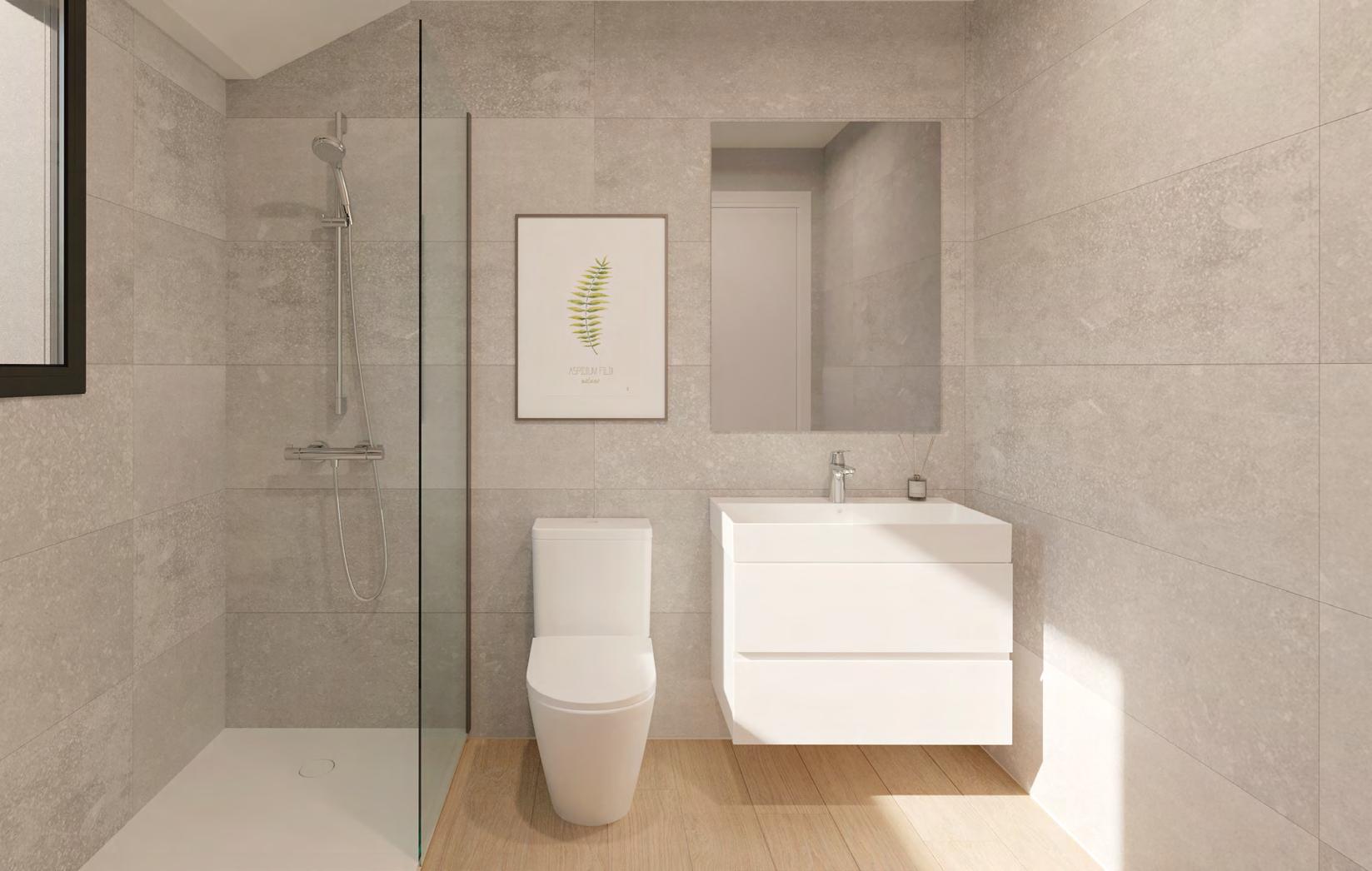 En los baños secundarios de planta primera dispondrás de lavabo cerámico sobre mueble suspendido, ducha o bañera encastrada (dependiendo del tipo) con grifería monomando y mampara de vidrio (en los baños con ducha). El inodoro será compacto con acabado blanco y estará adosado a la pared.