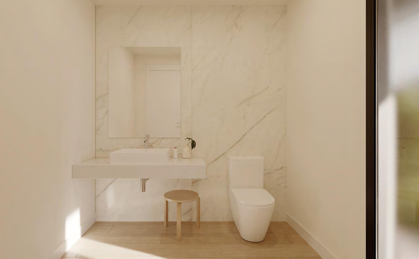 El aseo de la planta baja tendrá lavabo sobre encimera de cuarzo compacto. El inodoro será también compacto con acabado blanco y estará adosado a la pared.
