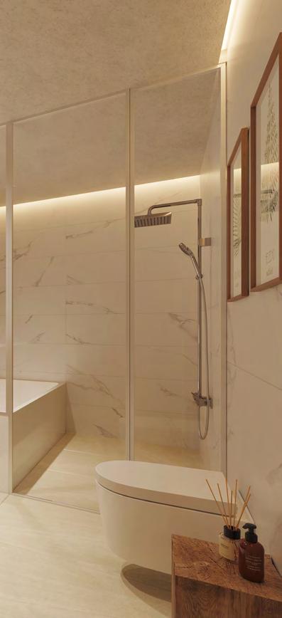 La baignoire sera équipée de robinets encastrés et la douche, dont le sol sera continu avec le reste de la pièce, sera équipée de robinets encastrés et d’un pommeau de douche au plafond afin de procurer une sensation de bien-être et de détente uniques.