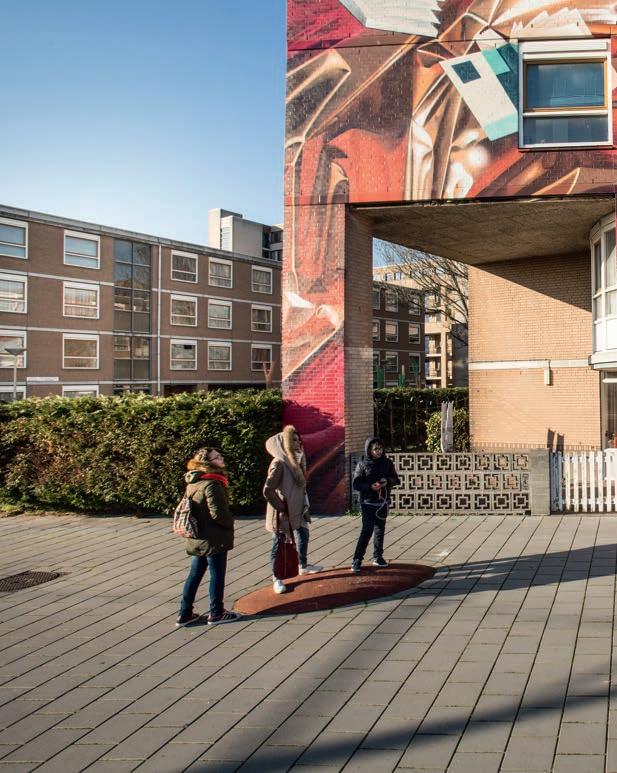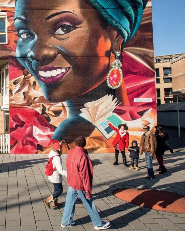 Natuurlijk, over kunst verschillen de meningen. Een enkele keer hoort bewoner August Hok-A-Hin (in het lichtbruine jasje) van een buurtgenoot dat die ‘al die graffiti’ niet mooi vindt. Zelf vindt hij de vier grote muurschilderingen aan de Laakweg in Den Haag prachtig. ‘Kijk naar die fantastische kleuren. Dit waren kale, grauwe muren. De buurt is echt opgevrolijkt.’ De muurschilderingen zijn het resultaat van de leefbaarheidsprijsvraag Mijn Thuis van Staedion. De kunstenaars Karski & Beyond wonnen. Voordat ze met hun spuitbussen aan de slag gingen, zijn ze bij de bewoners van de Laakweg op bezoek geweest om te praten over hun ideeën. Aanvankelijk was er geld beschikbaar voor drie muurschilderingen. Toen die klaar waren, kreeg Staedion veel telefoontjes van bewoners. Of ook de vierde flat zo’n mooie schildering kon krijgen? Dat is gelukt. Op januari zijn de vier muurschilderingen officieel ‘geopend’. Hok-A-Hin: ‘Tegenwoordig zeggen we trots dat we in één van de flats wonen met die mooie muurschilderingen.’