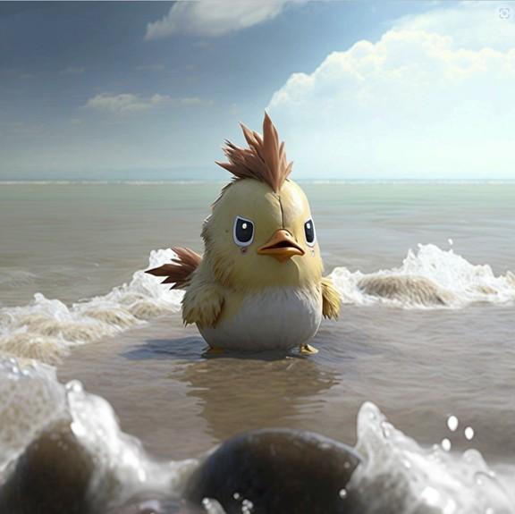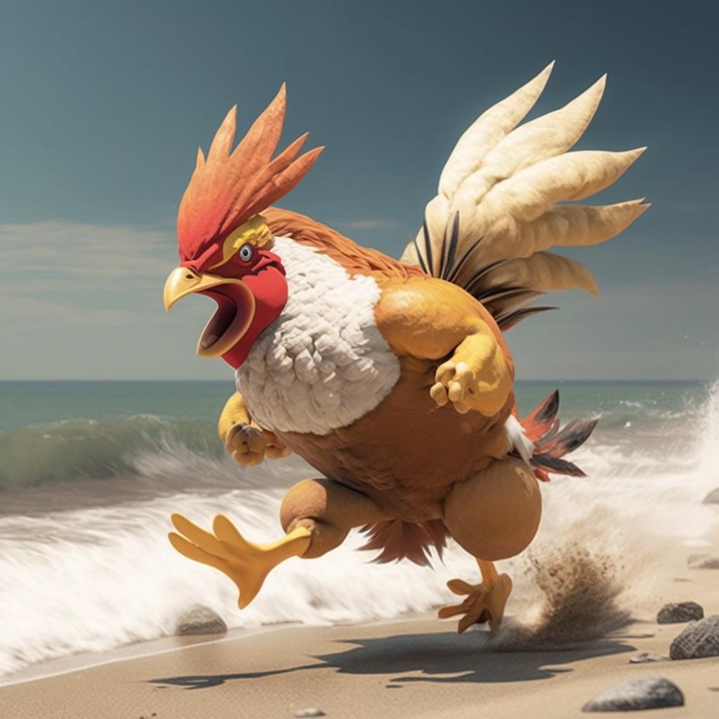 En fuyant la reine des crèmes glacées, Ash s’aperçoit sur la plage un gros coq qui courait. Et oui! c’est le petit poussin qui est devenu encore plus gros. Ash a une dernière chance pour l’attraper.