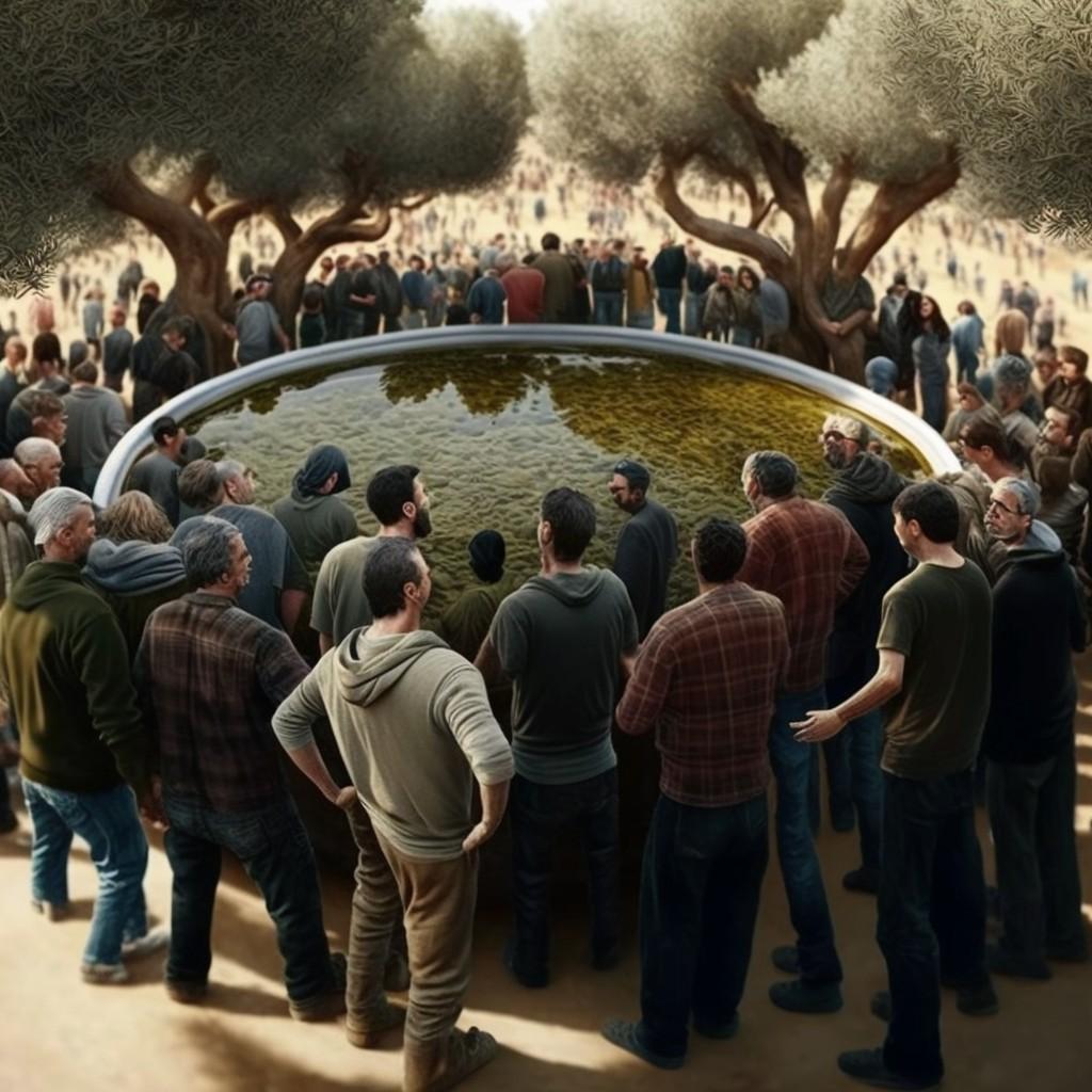 Après avoir nettoyé le pauvre monsieur, les habitants ont réussi à faire remplir un très gros bassin avec d’huile d’olive.