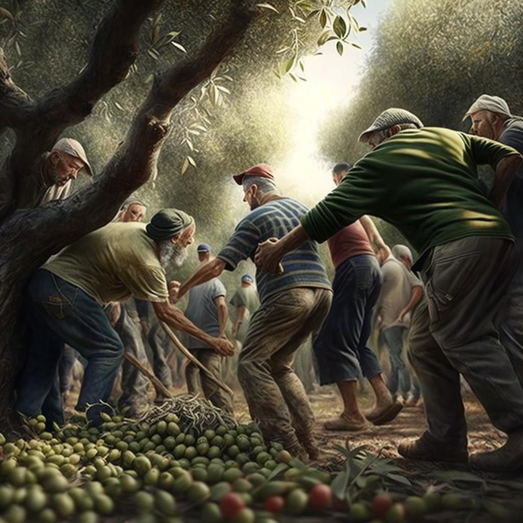 Pendant la collecte des olives, un des messieurs a glissé du haut de l’arbre. Il est tombé directement dans une bassinette pleine d’huile d’olive.
