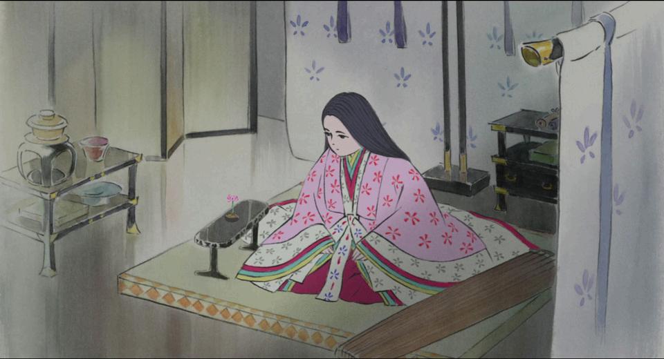 No ambiente de tecido e porcelana da nobreza, o próprio visual do filme parece construir-se como demasiado perfeito, em contraste com as singelas aguarelas dos cenários de natureza As paredes são tão polidas como a etiqueta exigida é opressora. Tudo é lindo da mesma maneira que um museu é lindo: tão cuidadosamente arranjado e tão indescritivelmente distante Kaguya é vestida, maquilhada, treinada e exposta para ser apreciada, e toda a beleza da perfeição é como um peso nos seus ombros, que a segura para ela ficar quieta