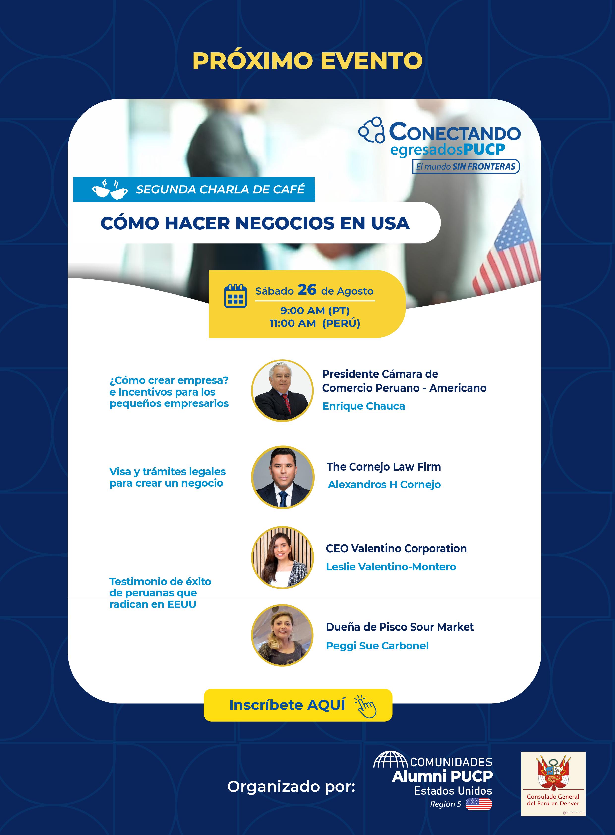 hacer negocios en USA”. En esta ocasión, el Cónsul General del Perú en Denver, Luis Felipe Solari, aportará su conocimiento en el ámbito de los negocios. También se contará con la participación de Enrique Chauca, Presidente de la Cámara de Comercio Peruano-Americana en Miami, cuyo éxito en el mundo empresarial es motivo de admiración. Asimismo, se enriquecerá la discusión con la presencia de Alexandros H Cornejo, del Grupo Legal Cornejo; Leslie Valentino-Montero, CEO de Valentino Corporation; y Peggi Carbonel, Dueña de Pisco Sour Market.
