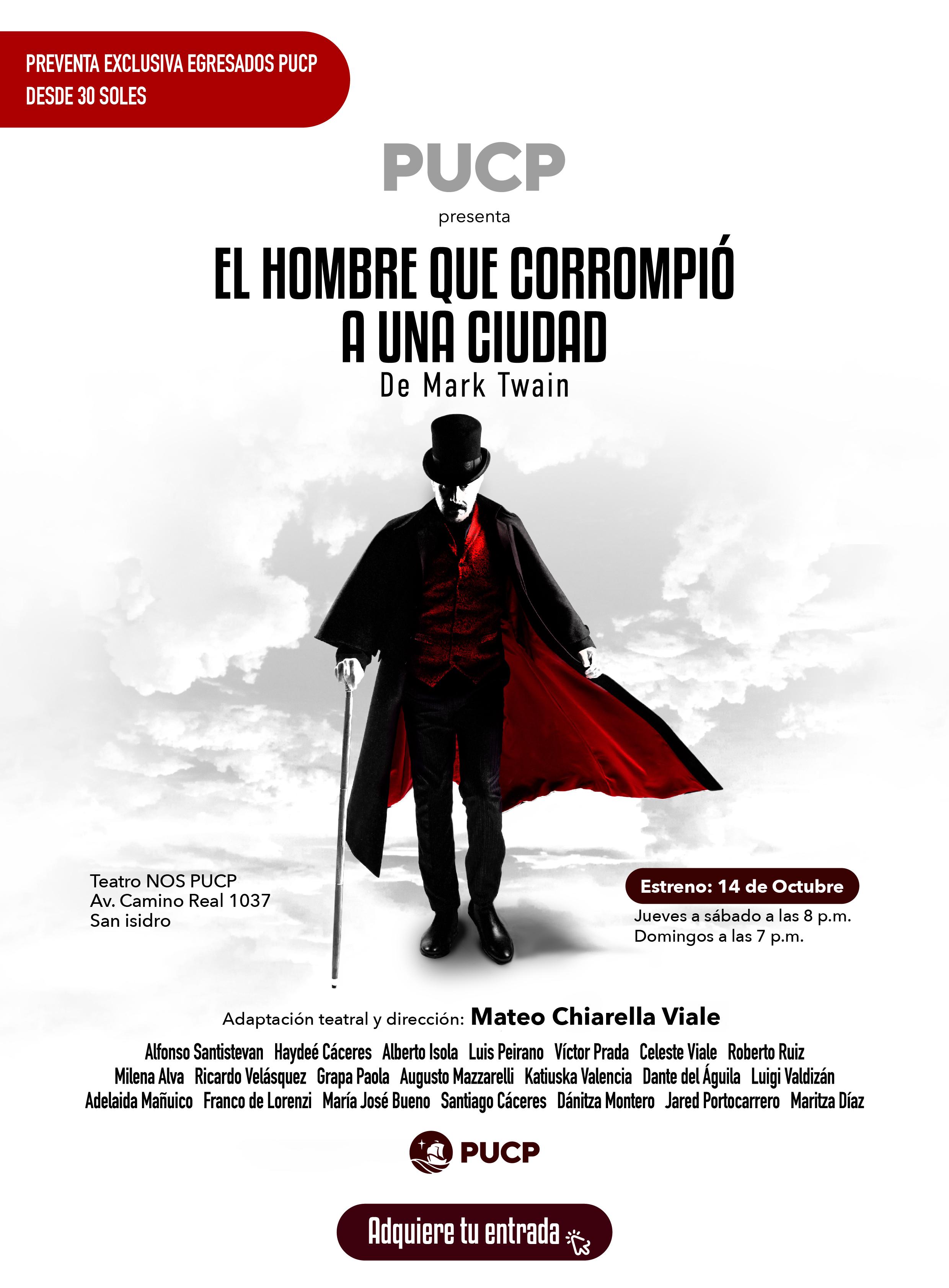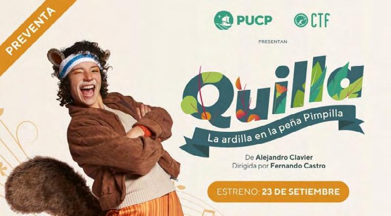 El CCPUCP presenta "Quilla: La ardilla en la Peña Pimpi ña", una historia que busca transmitir el valor de los árboles a los humanos. Acompaña a Quilla y su mejor amigo, el perro Bali ta, en esta aventura cargada de música criolla desde el 23 de septiembre. Además, no te pierdas "El hombre que corrompió a una ciudad", una adap tación del cuento de Mark Twain. Con humor y suspenso, esta obra explora la fragilidad moral de una sociedad. Admira la actuación de Luis Peirano y Alberto Isola, egresados distinguidos, desde el 14 de octubre en el teatro NOSPUCP. Aprovecha la preventa PUCP. ¡Todos los egresados reciben un descuento especial!