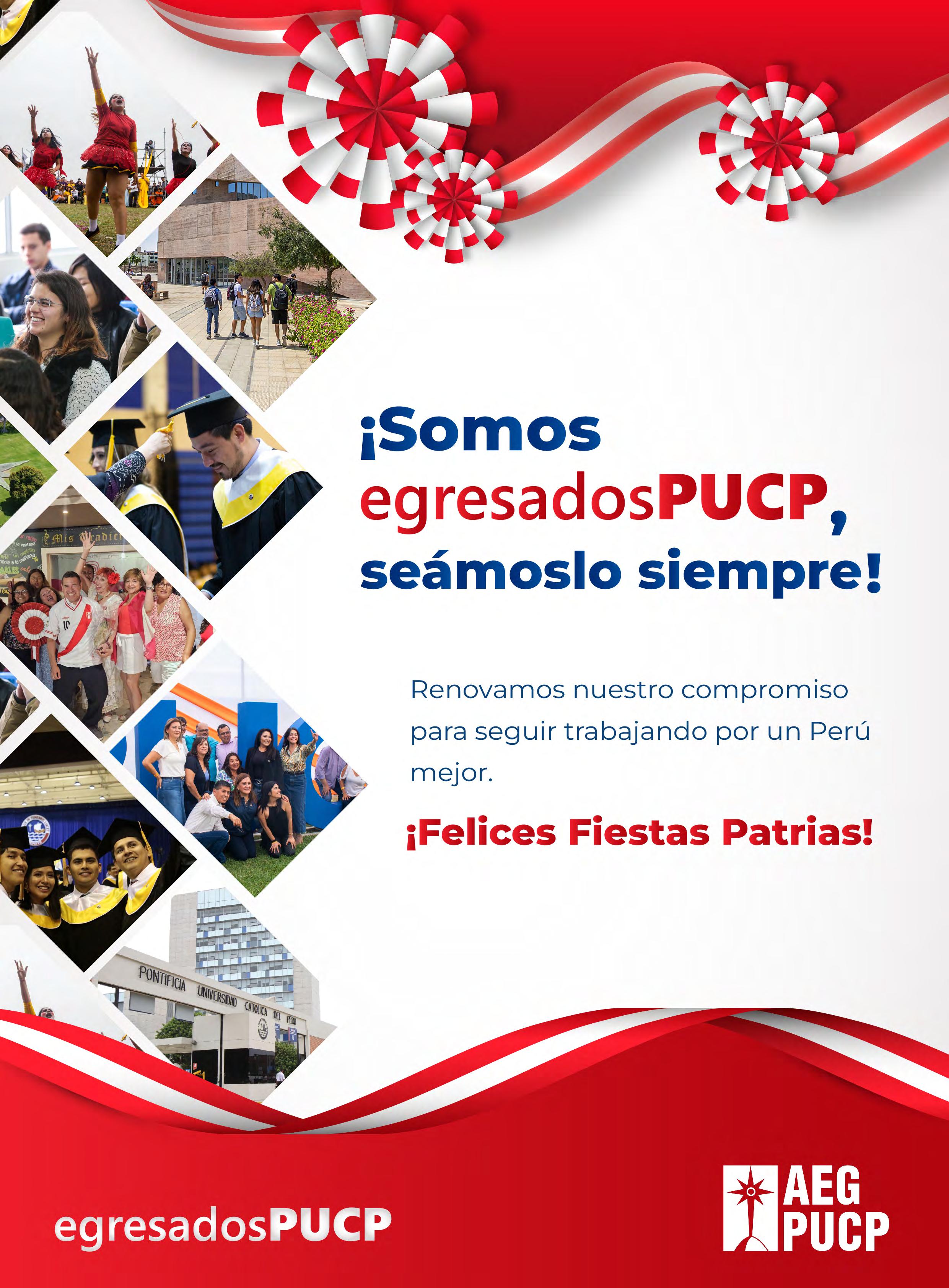 Mees grato dirigirme a ustedes en estas fechas que nos invitan a celebrar las Fiestas Patrias, dos años después de haber conmemorado el Bicentenario de nuestra independencia, un hito que nos permite reflexionar sobre nuestro pasado, analizar nuestro presente y mirar con esperanza el futuro. Hoy reiteramos nuestra convicción de dar la prioridad debida a la educación superior, con cada una de las carreras que se ofrecen en la PUCP, y compartir los logros de nuestros profesionales, quienes contribuyen a construir, fortalecer y mejorar la historia de nuestro país.