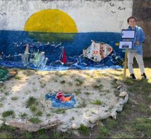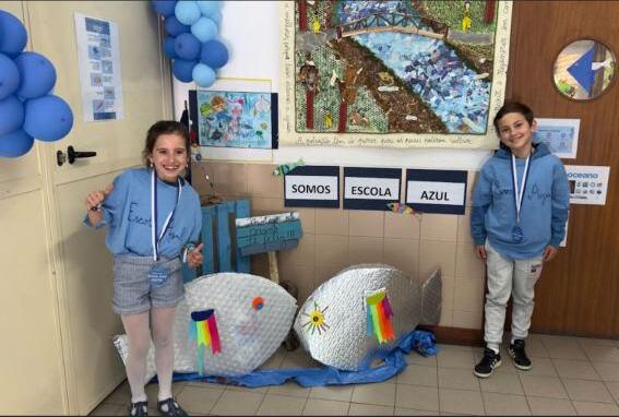 sição dentro da escola com trabalhos realizados pelos alunos sobre a EscolaAzul e sobre a Eco-Escola ao longo do ano letivo, o Mural Escola Azul pintado pelos alunos, a escultura exterior com materiais reutilizados (praia e mar com animais marinhos) e as oficinas no recreio. Entre as atividades no recreio destacam-se a realização de decorações pelos alunos reutilizando com pinturas de joaninhas e sapos em seixos; flores com vários materiais, vasos para as árvores,