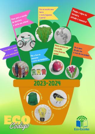 A ideia de se fazer para o Poster Eco-Código um manjerico, com os desenhos inseridos em balões coloridos e as frases em bandeirinhas abordando temas relacionados com os resíduos, energia, água e comunidades sustentáveis, surgiu por ser a época dos Santos Populares. <IP