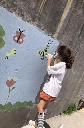 Na pintura, que representa o ecossistema do jardim na frente da escola, desenharam aves, borboletas, abelhas e outros seres, que fazem das nossas árvores, flores e solo, o seu habitat perfeito, representando na imagem um ecossistema próximo daquele que a escola mantém.