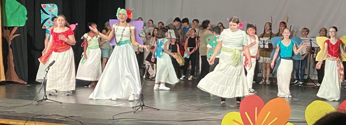 e as suas borboletas: Brasil, México, EUA, Japão, Arábia, Alemanha, França e Portugal. A música, as danças, o teatro, o humor e os clichés foram uma constante ao longo da peça brilhantemente representada pelos alunos que integram o Clube. Contaram ainda com a participação das turmas 6A e 7B, que dançaram