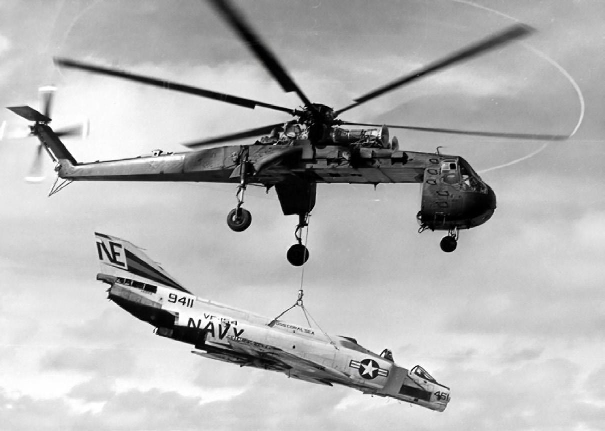 This F-4B Phantom II of the US Navy’s Strike Fighter Squadron (VFA) 154 “Black Knights”, ‘149411/NK-100’ crashed near Cam Ranh Bay, South Vietnam on December 20, 1968. Its pilots ejected at low altitude and both lost their lives. Its wreckage was airlifted by this CH-54A of the US Army’s 478th Heavy Helicopter Company. (U.S. Army photo)