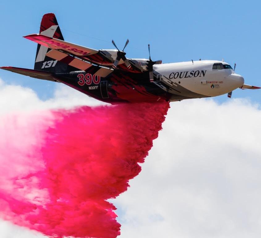 A Coulson C-130 drops a sweeping line of PHOS-CHEK during firefighting operations.