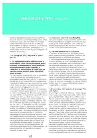 derecho a voto de los matriculados adherentes. Entonces esas cosas provocan una mezcla de nostalgia y rabia, porque recordando lo que era, hoy te encontrás con un colegio provincial insensible que en vez de unir, de llamar, de moldear y formar, de organizar la matrícula, a los jóvenes y a los viejos, los elimina, los expulsa. ¿Qué mejor que un anciano para el Tribunal de Ética? ¿Por qué no de jurado o en la asesoría de concursos? LA PLANIFICACIÓN PARA CONVENCER AL PODER POLÍTICO CG >En la época de recuperación democrática hubo un suceso novedoso cuando el entonces intendente Horacio Usandizaga, recientemente electo, solicita al Centro de Arquitectos una sugerencia para la Secretaría de Planeamiento de la Municipalidad de Rosario, cosa que marcó un hito importante en la historia del desarrollo urbano de Rosario. Fue muy interesante porque se pudo armar un buen equipo y lo planificado salió bien, fue muy satisfactorio, la continuidad de esta actitud llega hasta hoy. En esto hay una anécdota que siempre recuerdo. Me reúno con Usandizaga y me propone el cargo, yo le entrego mi currículum y propongo a Chola Ansaldi para que me acompañese en la gestión. Luego me confirma el cargo pero me dice que lamentablemente el partido le sugiere otro nombre para que me acompañe y ahí me jugué una patriada. Yo no lo conocía de antes a Usandizaga y le dije: «No doctor, no puedo tomar esta responsabilidad sin el apoyo de la arquitecta Ansaldi, no puedo aceptar». Claro, yo a Chola la conocía desde el Instituto, aparte tenía experiencia en la obra pública y una gran capacidad de trabajo, como Matilde. Estábamos a dos días de la asunción al gobierno y Usandizaga dijo: «Bueno, está bien. Listo». Y así empezamos. Fue una suerte porque pudimos armar un gran equipo de trabajo. Con Adolfo Bisellach, que estaba en la Secretaría de Obras Públicas, nos pusimos de acuerdo y decidimos armar un equipo de diseño mixto de las dos secretarías. Hicimos un concurso de antecedentes para formarlo y allí entraron arquitectos como Sarti, Cerfoglio, Redondo y Garaffa (que fue nombrado pero después no se incorporó). Realmente un gran equipo de chicos, ya que en ese momento eran muy jóvenes. En la Secretaría de Planeamiento creamos la oficina del Plan Director e hicimos otro concurso para este equipo. Allí entraron Manuel Fernández De Luco, Ricardo Kingsland y un matrimonio de Entre Ríos que venía de un taller de urbanismo de Buenos Aires.
