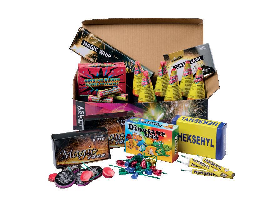 www.afac.dk 27 THUNDERKING SORTIMENT 4 thunderballs i farverne rød og grøn springer ud i store eksplosioner i himlen og forsvinder som stjernedrys. VARENR. BR3 NEM 92 GRAM | 4 SKUD I ALT | 30 MM | 4 STK. HYLEMIX Heksehylsortiment med 3 forskellige størrelser af heksehyl, der hver især skriger på hver deres måde! 3 stk. store, 5 stk. mellem og 45 stk. normale. VARENR. HE53 NEM 54 GRAM | 53 HYL | STR. S/M/L | 53 STK. 9995 53 stk. 9995 10 stk. 9995 THUNDERBALL SORTIMENT Thunderballs sortiment med kraftige farver og en masse glimmer, der fylder himlen. Småt fyrværkeri kan også give brag! VARENR. RL75 NEM 79 GRAM | 10 SKUD I ALT | 20 MM | 10 STK. JUNIOR ARTIKLER 53 BESTIL NR. 55 BESTIL NR. 54 BESTIL NR. 14995 SPAR 4995 FRIT VALG TA' 2 PAKKER (BESTIL NR. 53-55) TILBUD 18 2xvalgfri pakker. Gælder BR3, RL75, HE53. Normalpris 199,90 kr. VARENR. TILBUDSPAKKE 18 NEM MIN. 108 GRAM | MIN. 8 SKUD | 2 DELE 56 BESTIL NR.