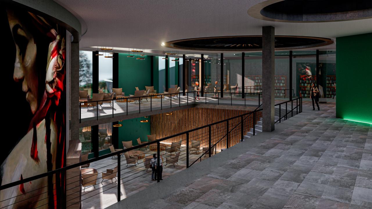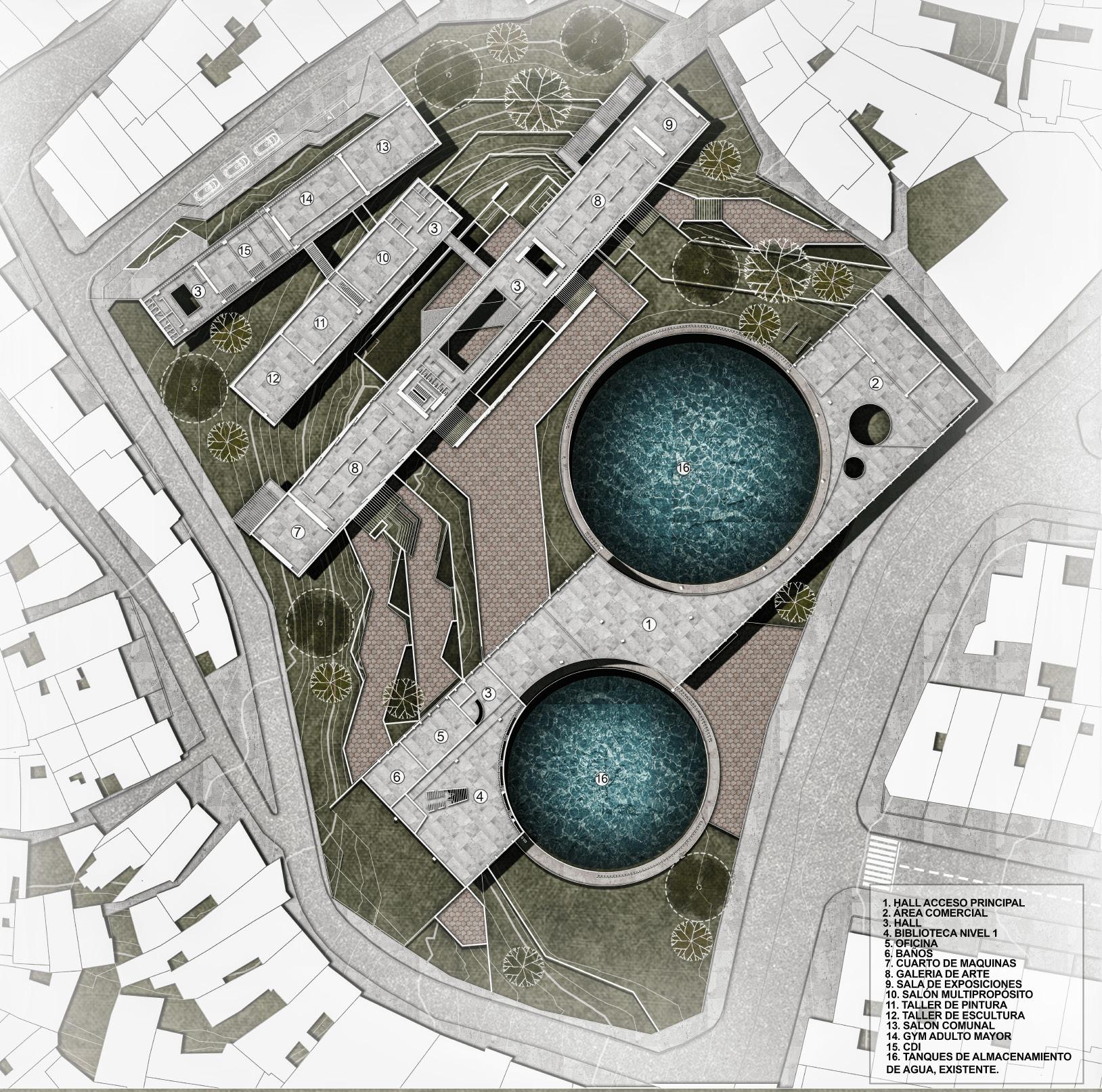 Con la propuesta se busca minimizar al maximo las modificaciones al terreno jugando con quiebres y un gran puente que se levanta sobre el terreno que proporcionan, recorridos y perspectivas entre el interior y exterior dejando expuestas vistas panoramicas hacia la ciudad. Se plantea una gran plataforma que amarra los 2 tanques existentes reduciendoles la escala, sin robarles el protagonismo y este a su vez crea un umbral de acceso sobre el cual se dispone la biblioteca en 2 niveles, siendo esta la actividad de caracter mas publico, que a su vez es dotada de establecimientos comerciales que ayudarian a suplir los costos de mantenieto del edificio.