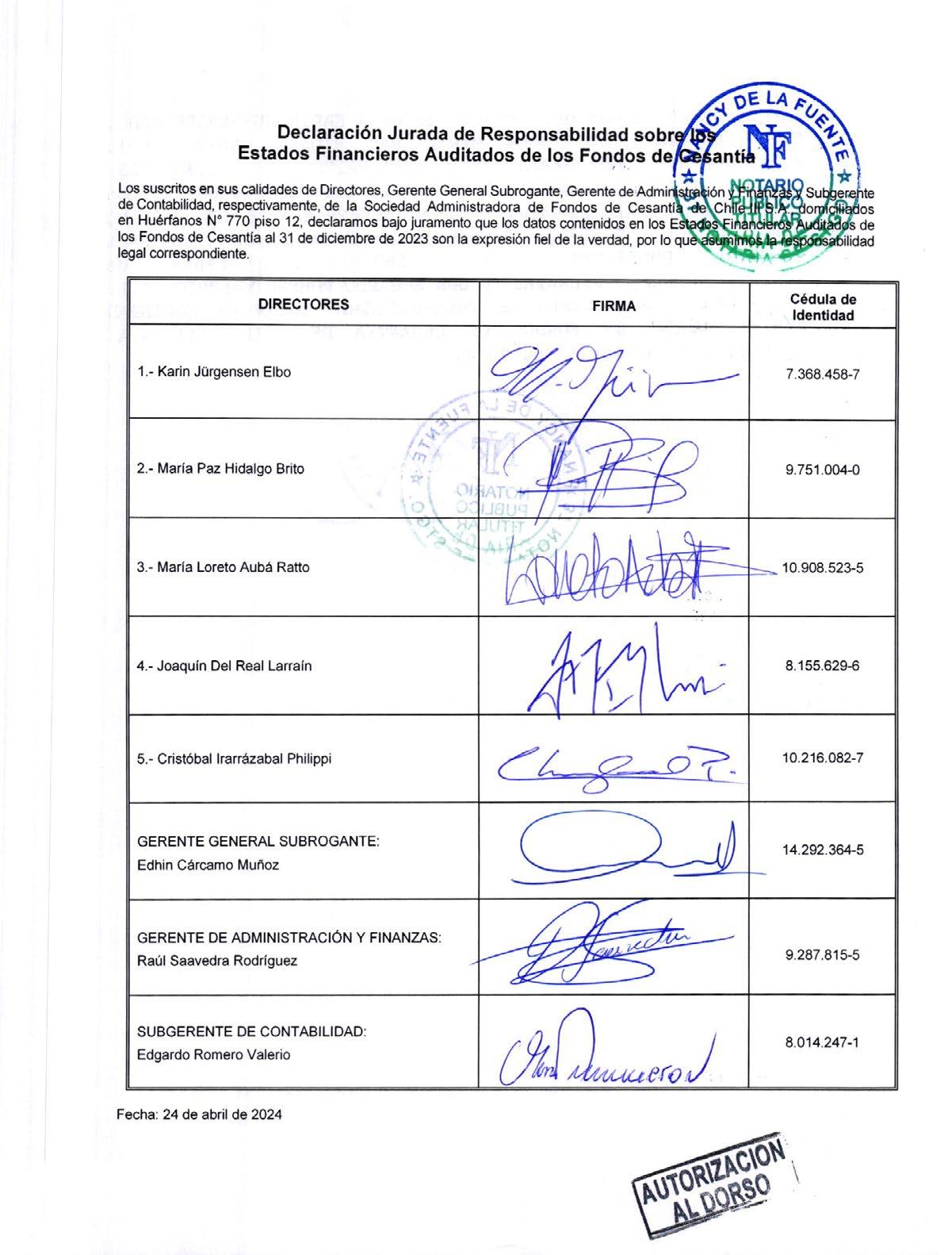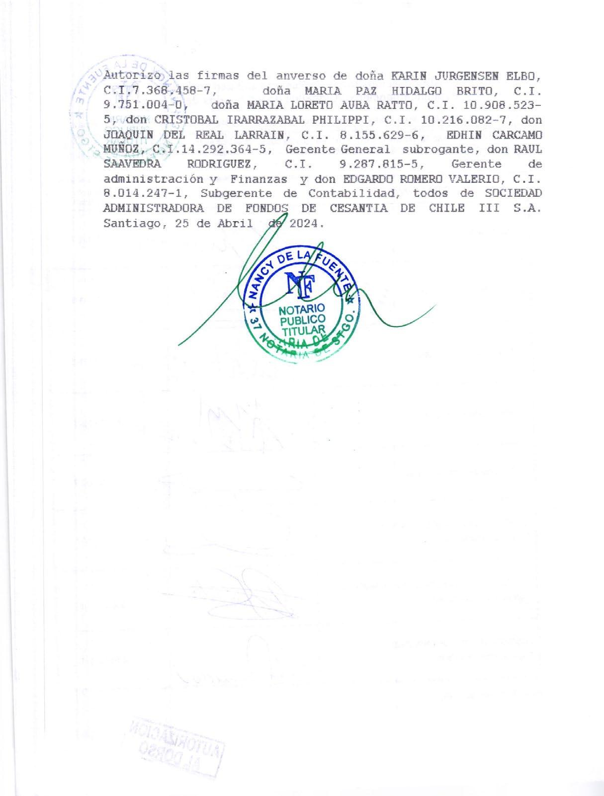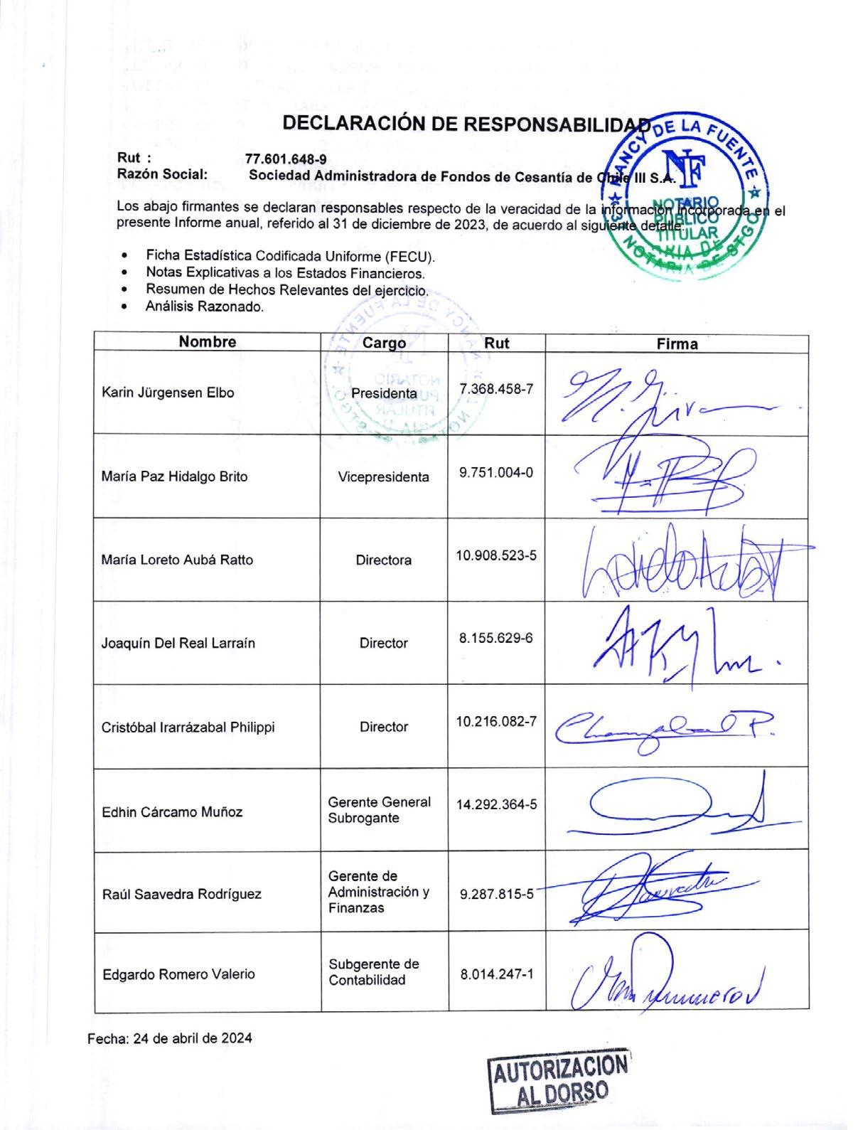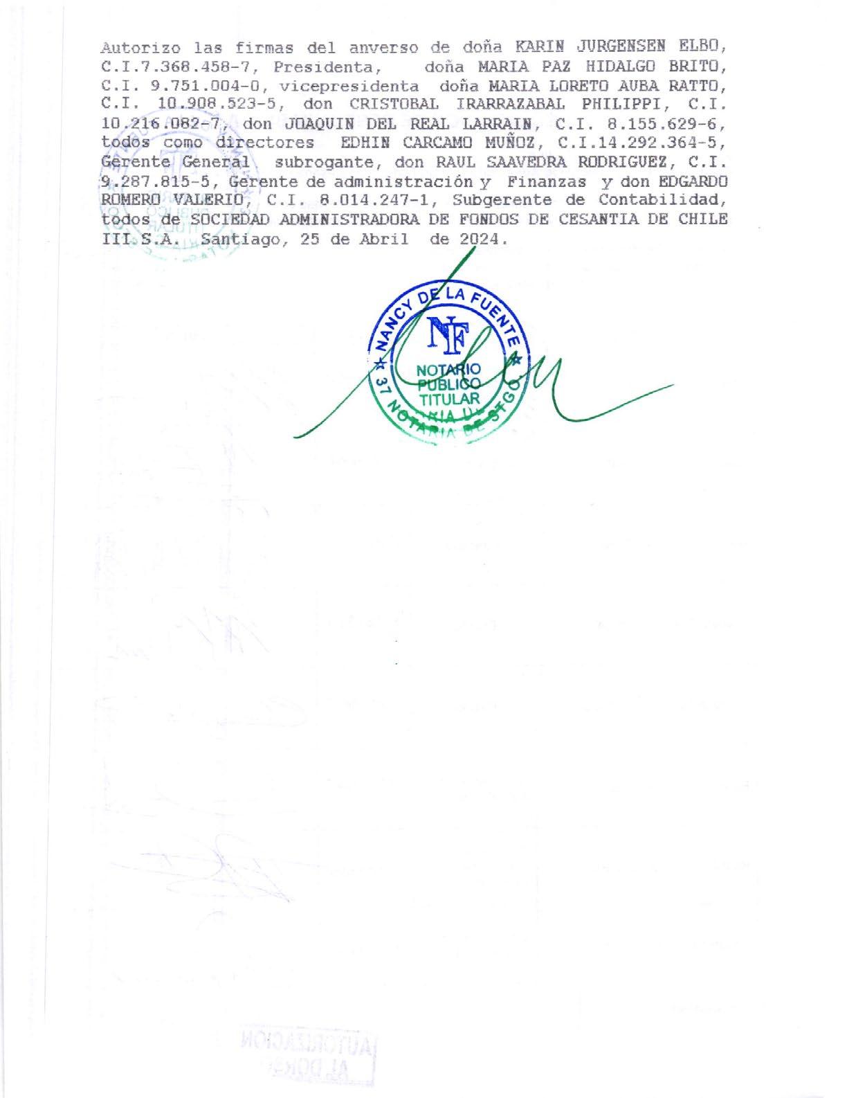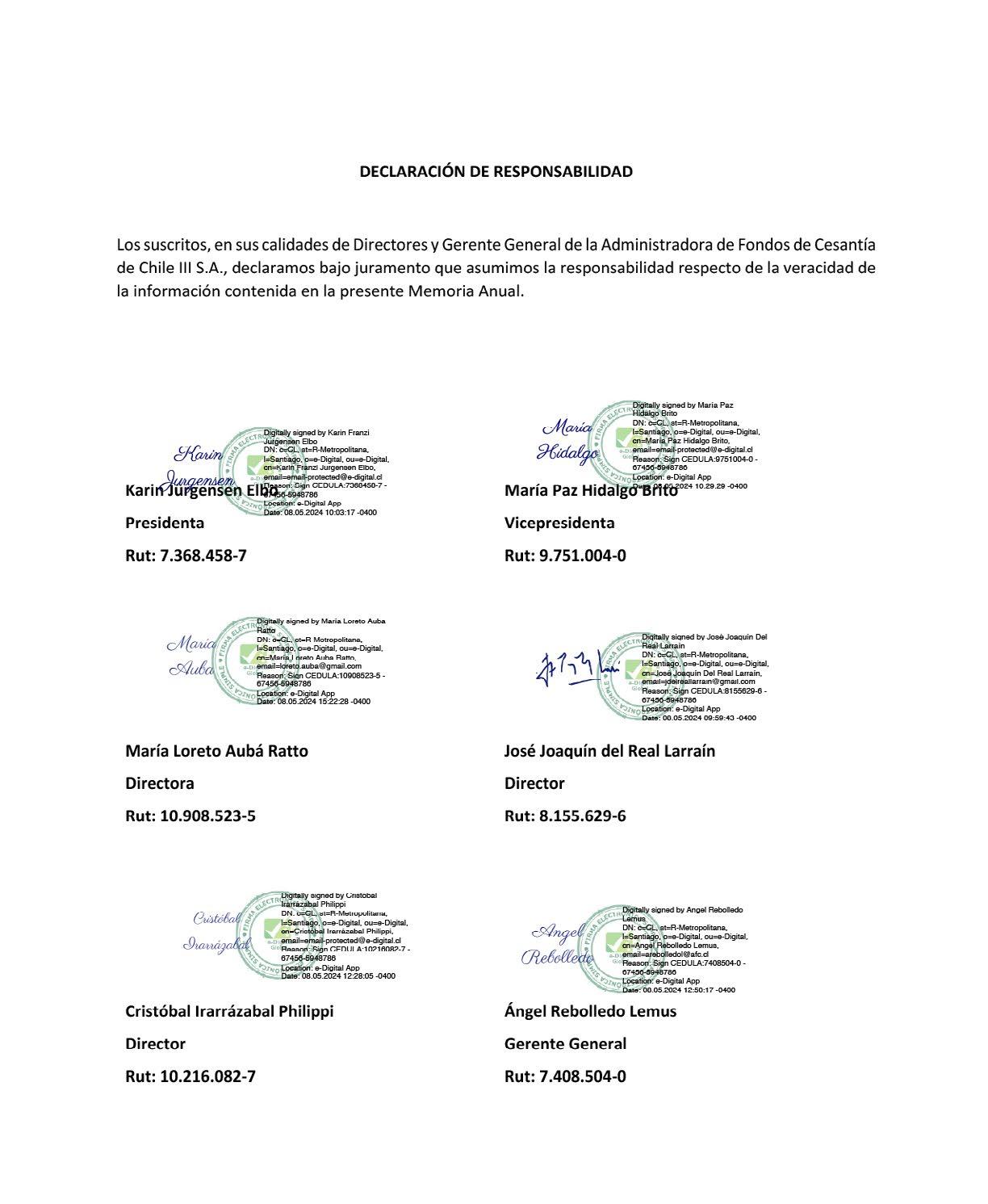 La presente Memoria Anual de la Sociedad Administradora de Fondos de Cesantía de Chile III S.A., correspondiente al ejercicio financiero del año 2023, fue aprobada en la 32° sesión extraordinaria de directorio, con fecha 07 de mayo de 2024.