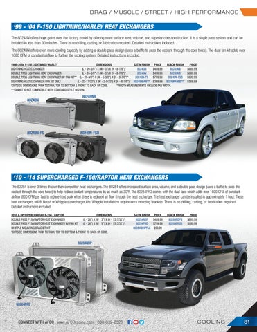 ‘99 - ‘04 F-150 LIGHTNING/HARLEY HEAT EXCHANGERS The 80245N offers huge gains over the factory model by offering more surface area, volume, and superior core construction. It is a single pass system and can be installed in less than 30 minutes. There is no drilling, cutting, or fabrication required. Detailed instructions included. The 80249N offers even more cooling capacity by adding a double pass design (uses a baffle to pass the coolant through the core twice). The dual fan kit adds over 1080 CFM of constant airflow to further the cooling system. Detailed instructions included. 1999–2004 F-150 LIGHTNING / HARLEY DIMENSIONS SATIN FINISH PRICE BLACK FINISH PRICE LIGHTNING HEAT EXCHANGER (L - 26-3/8”) X (W - 3”) X (H - 8-7/8”)* 80245N $489.99 80245NB $689.99 DOUBLE PASS LIGHTNING HEAT EXCHANGER (L - 26-3/8”) X (W - 3”) X (H - 8-7/8”)* 80249N $499.99 80249NB $699.99 DOUBLE PASS LIGHTNING HEAT EXCHANGER W/ FAN KIT** (L - 26-3/8”) X (W - 5-3/8”) X (H - 8-7/8”)* 80249N-FS $799.99 80249N-FSB $999.99 LIGHTNING HEAT EXCHANGER FAN KIT ONLY (L - 22-11/32”) X (W - 2-5/32”) X (H - 8-7/8”)* 80249NFAN*** $369.99 80249NFANB*** $569.99 *OUTSIDE DIMENSIONS TANK TO TANK, TOP TO BOTTOM & FRONT TO BACK OF CORE. **WIDTH MEASUREMENTS INCLUDE FAN WIDTH. ***FAN KIT IS NOT COMPATIBLE WITH STANDARD STYLE 80245N.