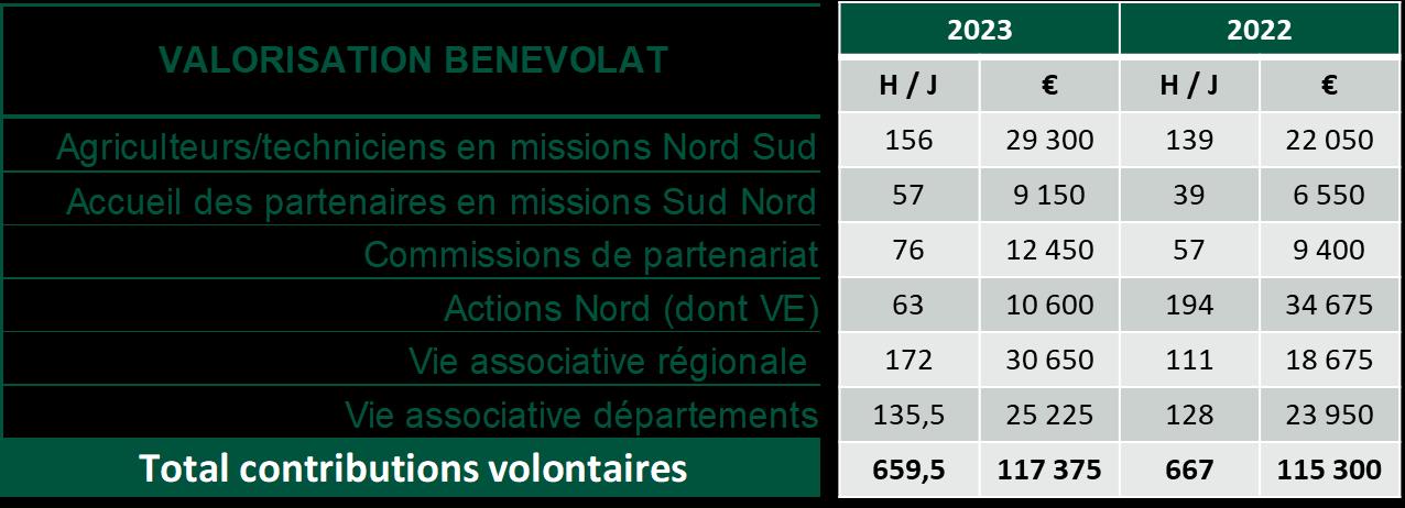 Le temps passé valorisé comptablement des bénévoles est en hausse en 2023, grâce aux missions NS et SN (certaines financées par Afdi Nat), à plus de commissions de partenariat et à la vie associative régionale et départementale, malgré l’absence de voyages d’étude.